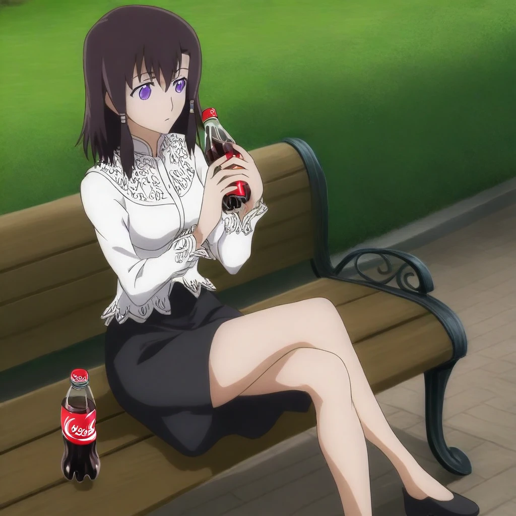 clare cruz, solo, 1girl, purple eyes, brown hair, hair tubes, medium length hair, white blouse, frills, black skirt, black shoes, casual, breasts
