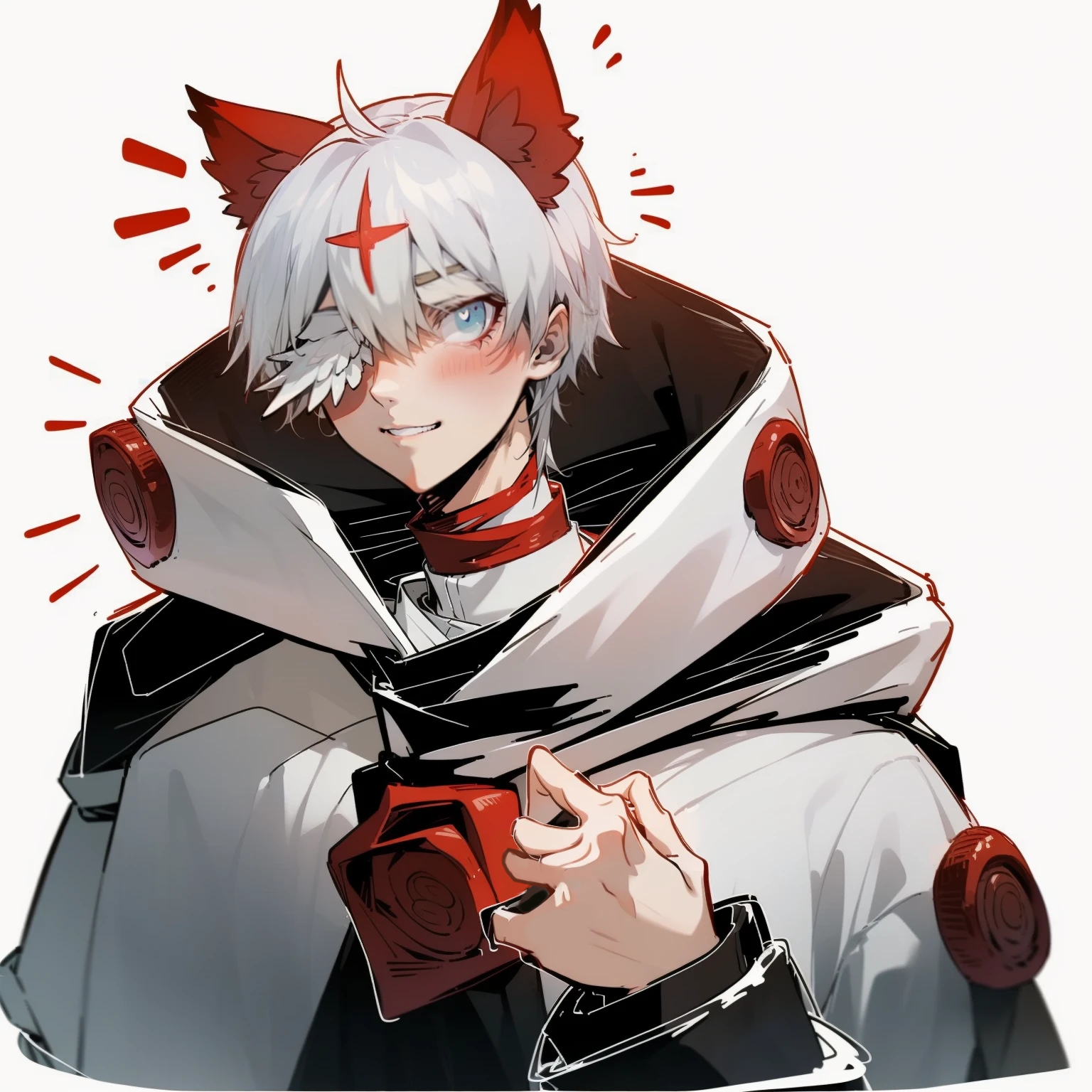 Red cat ears, star on head, wing eye patch, white hair, blue eye, long coat, hood, guilty gear, Asuka R Kreutz