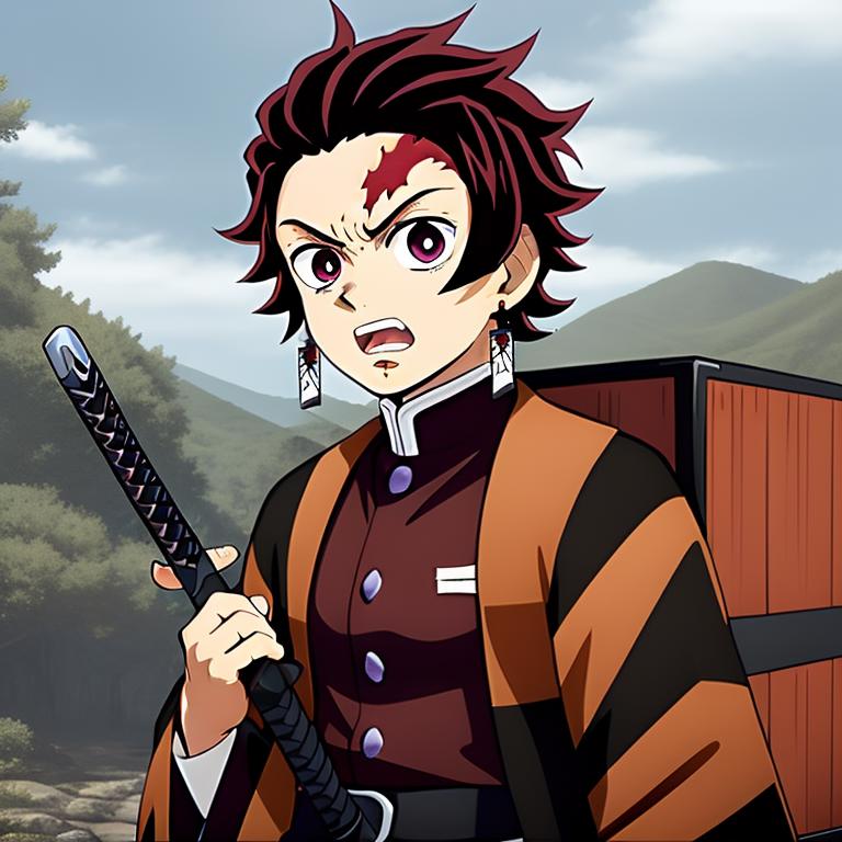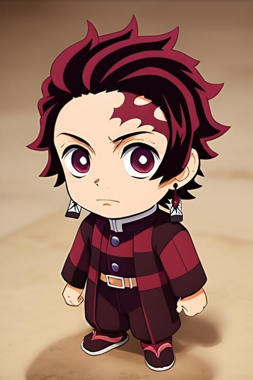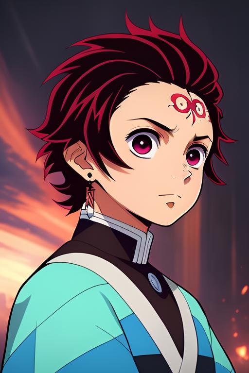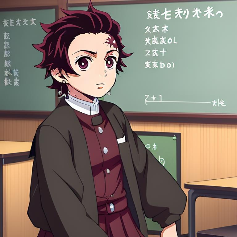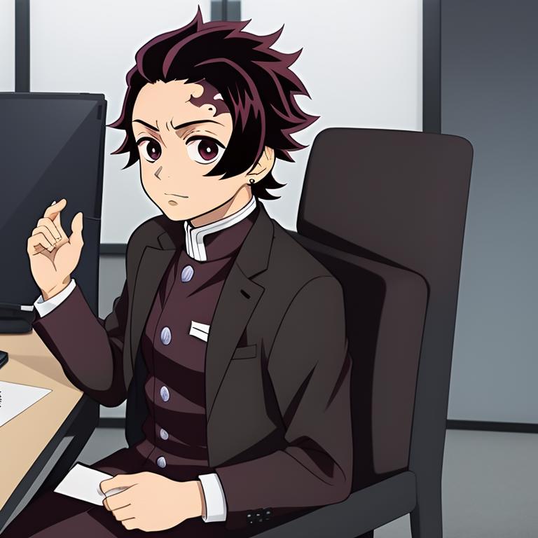 for example: 1 boy,kamado_tanjirou, wearing black suit, realistic, in the Office