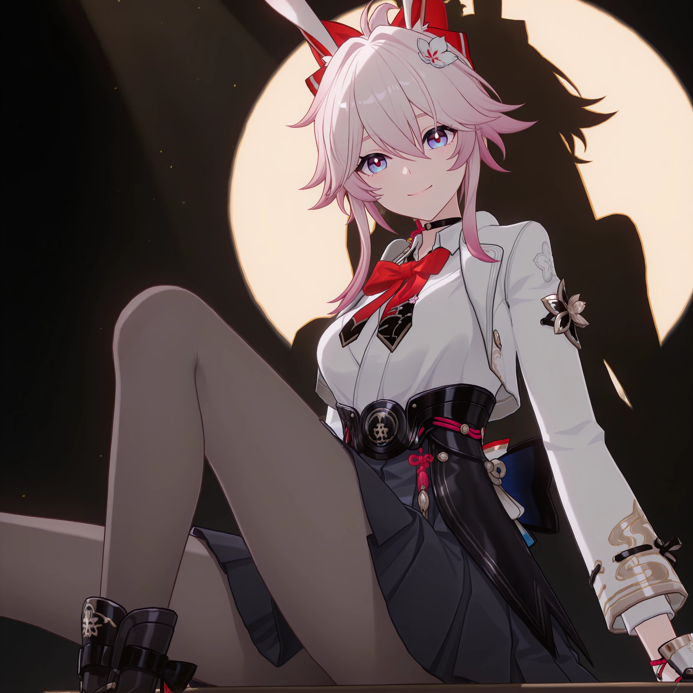 masterpiece, best quality, very aesthetic, newest, hires, Evanescia, 1girl, solo, smile, looking at viewer, white jacket, white shirt, bow, pantyhose, boots, detailed light, simple background,全身可尝试添加full body或boots 。
