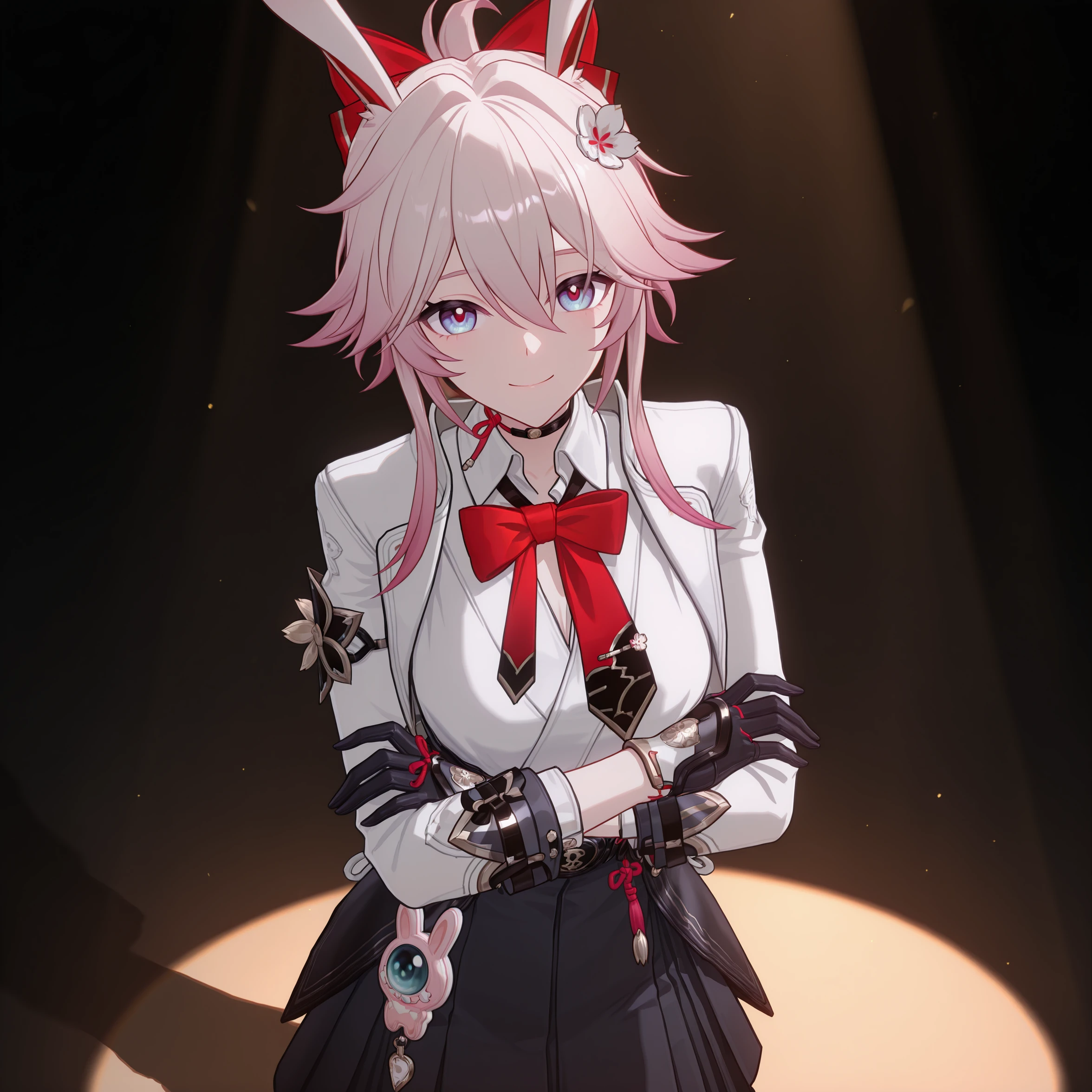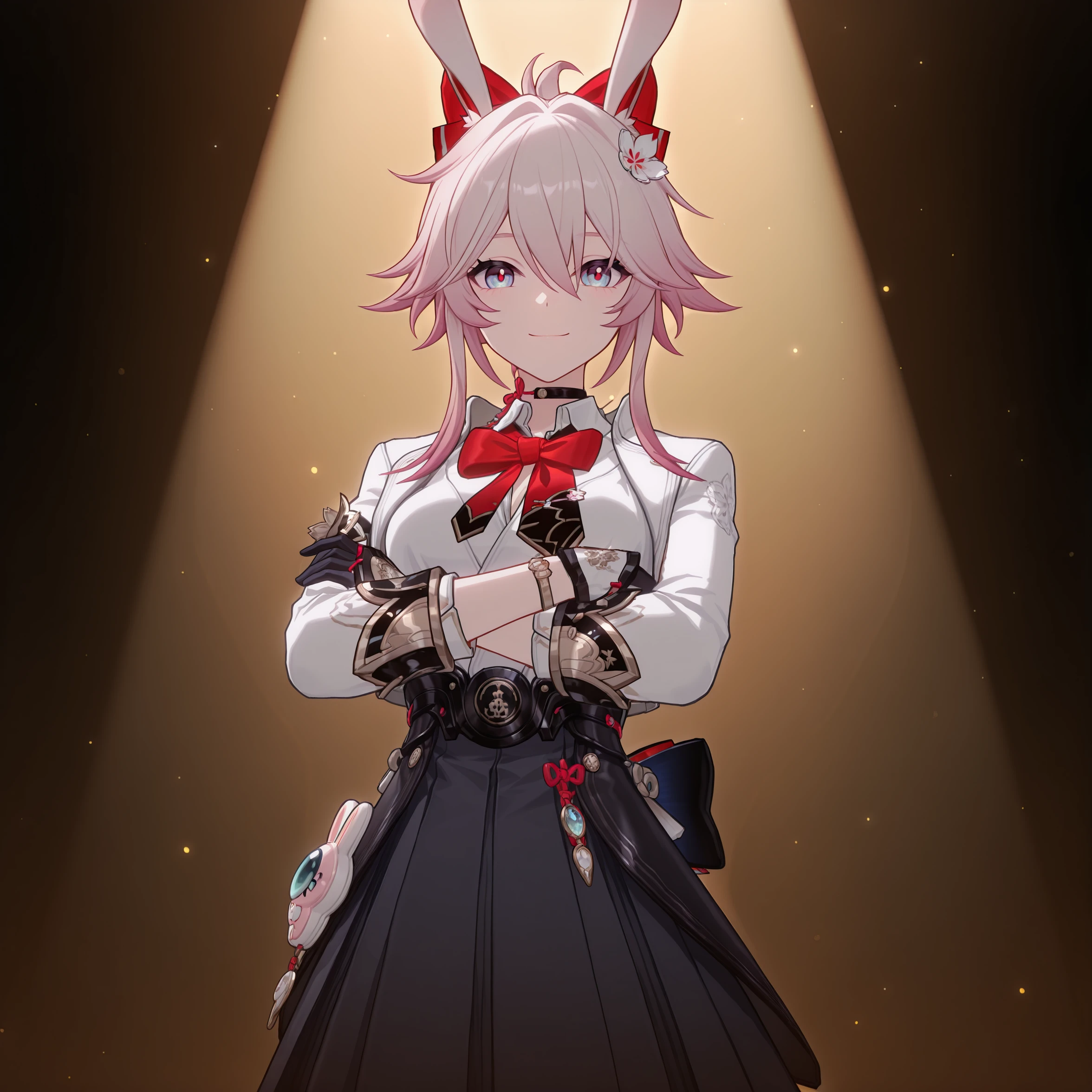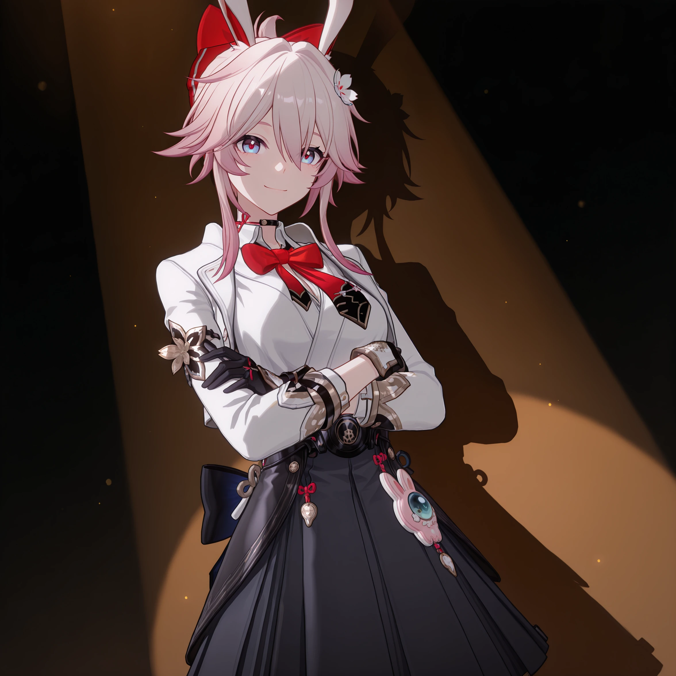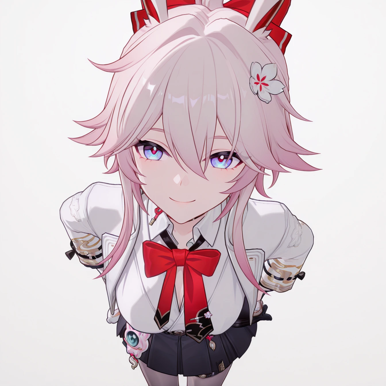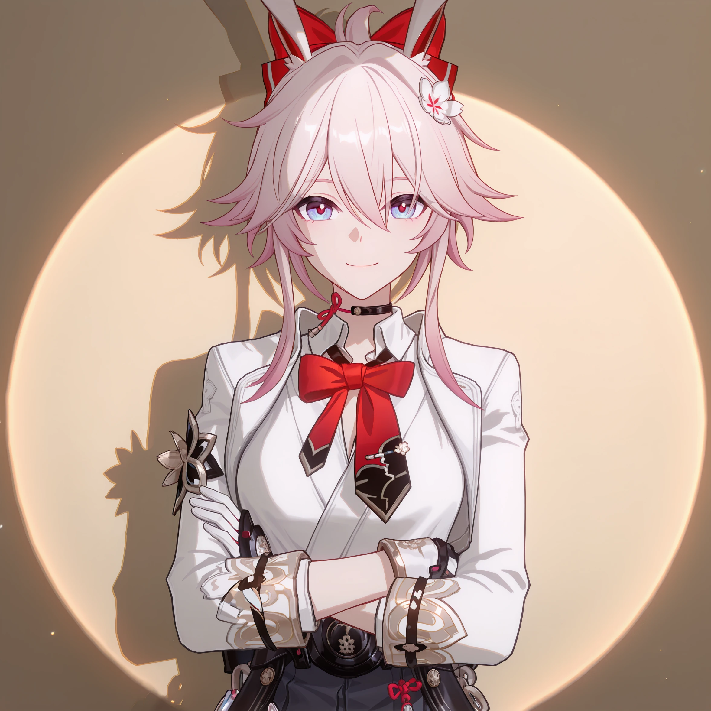 masterpiece, best quality, very aesthetic, newest, hires, Evanescia, 1girl, solo, looking at viewer, smile, white jacket, white shirt, bow, upper body, detailed light, simple background,full body: