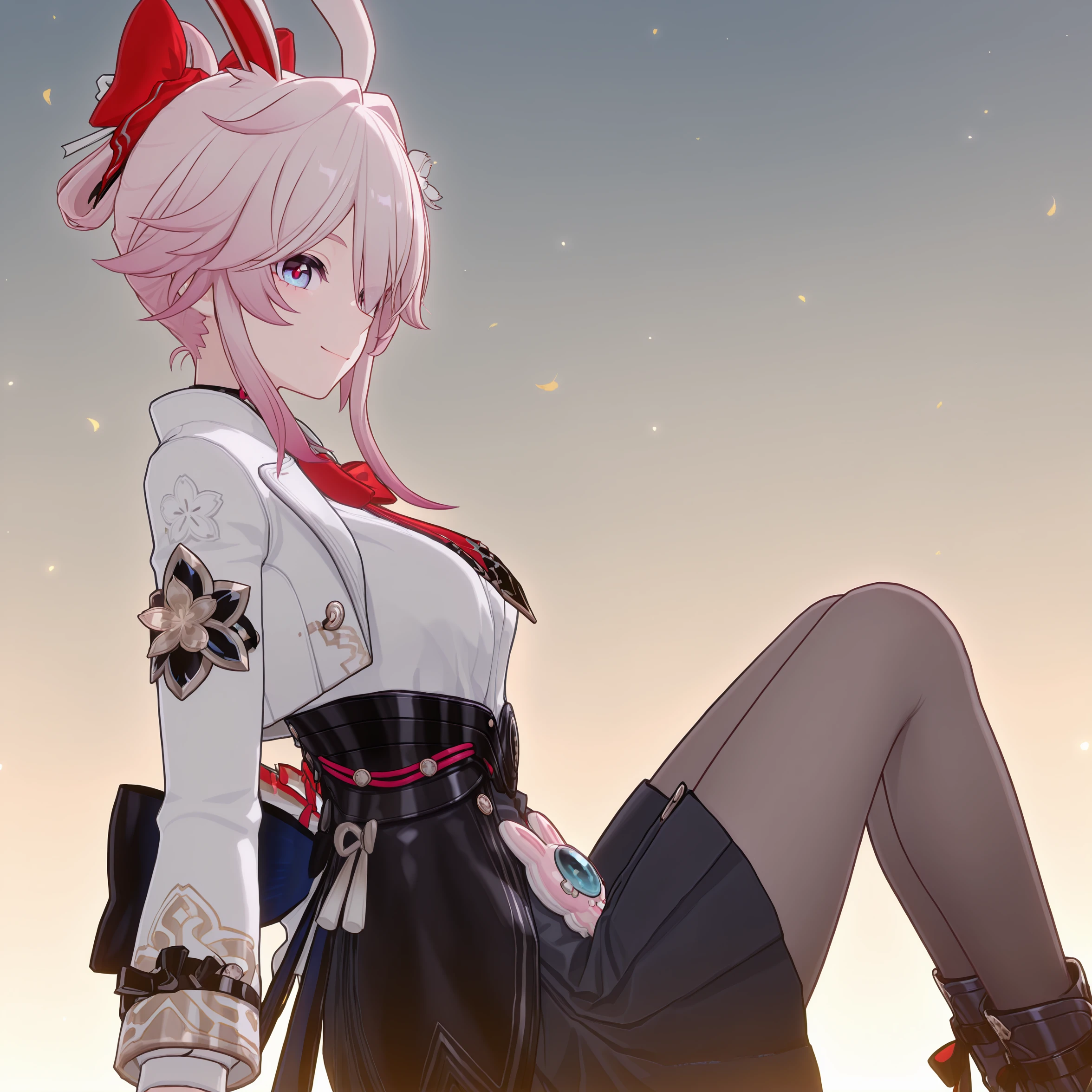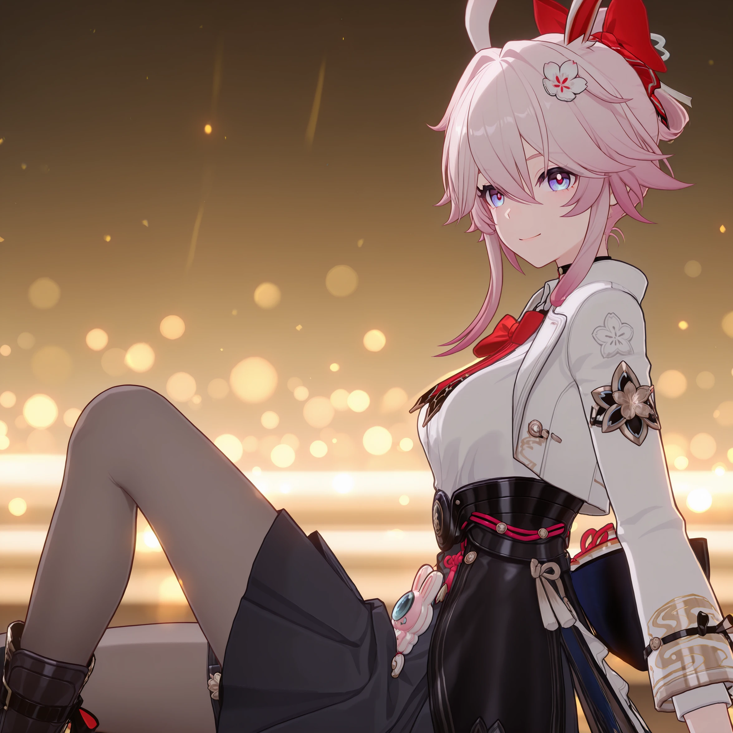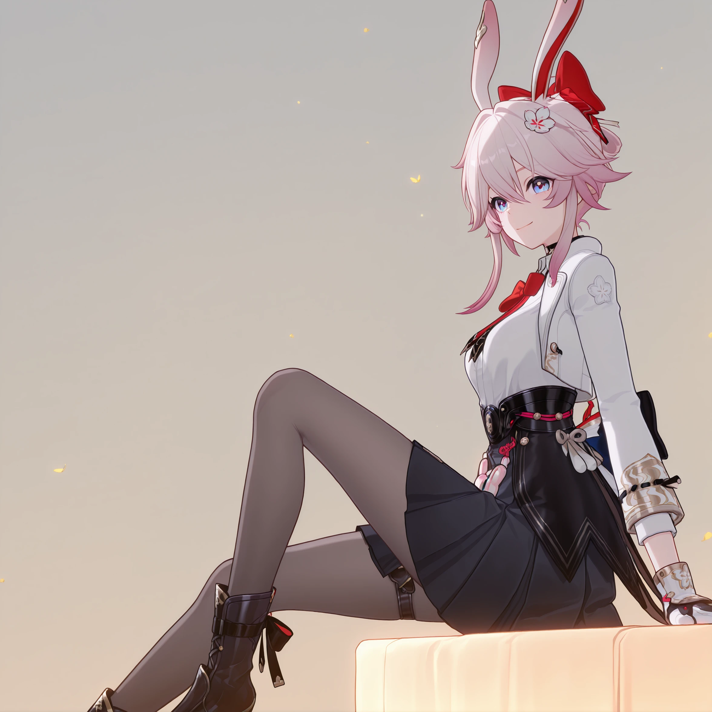 masterpiece, best quality, very aesthetic, newest, hires, Evanescia, 1girl, solo, smile, looking at viewer, white jacket, white shirt, bow, pantyhose, boots, detailed light, simple background,For full-body shots, you can try adding full body or boots.