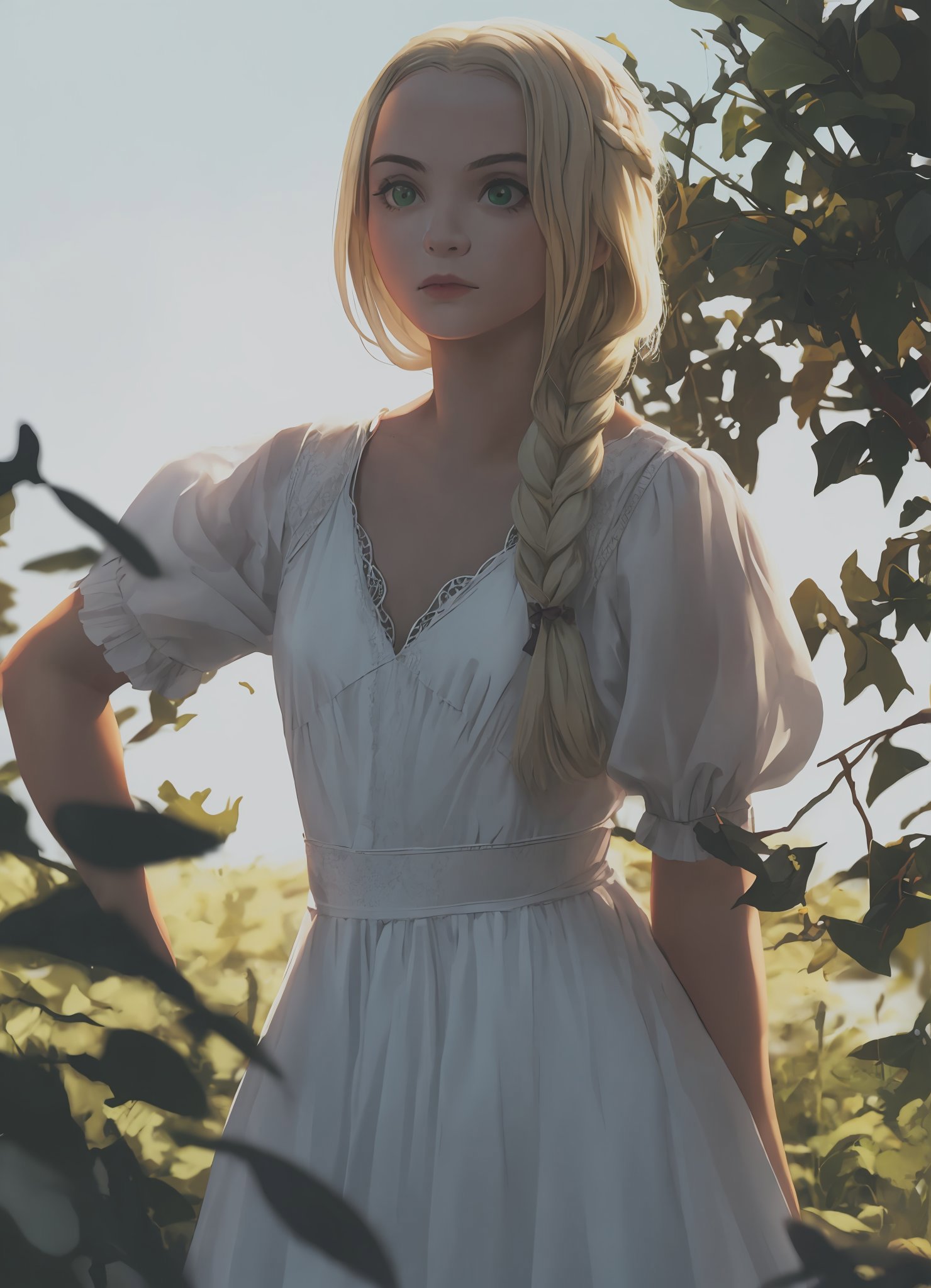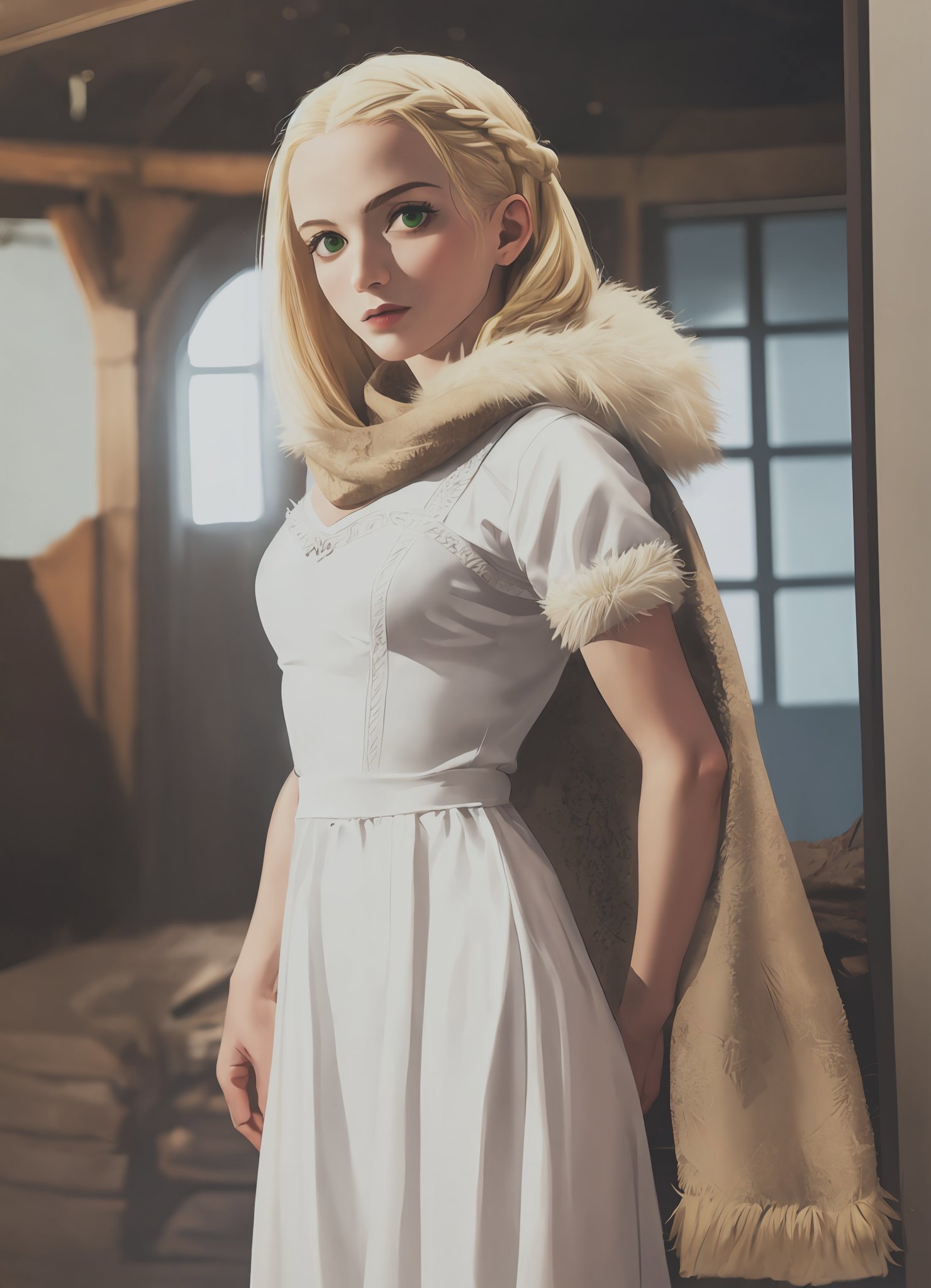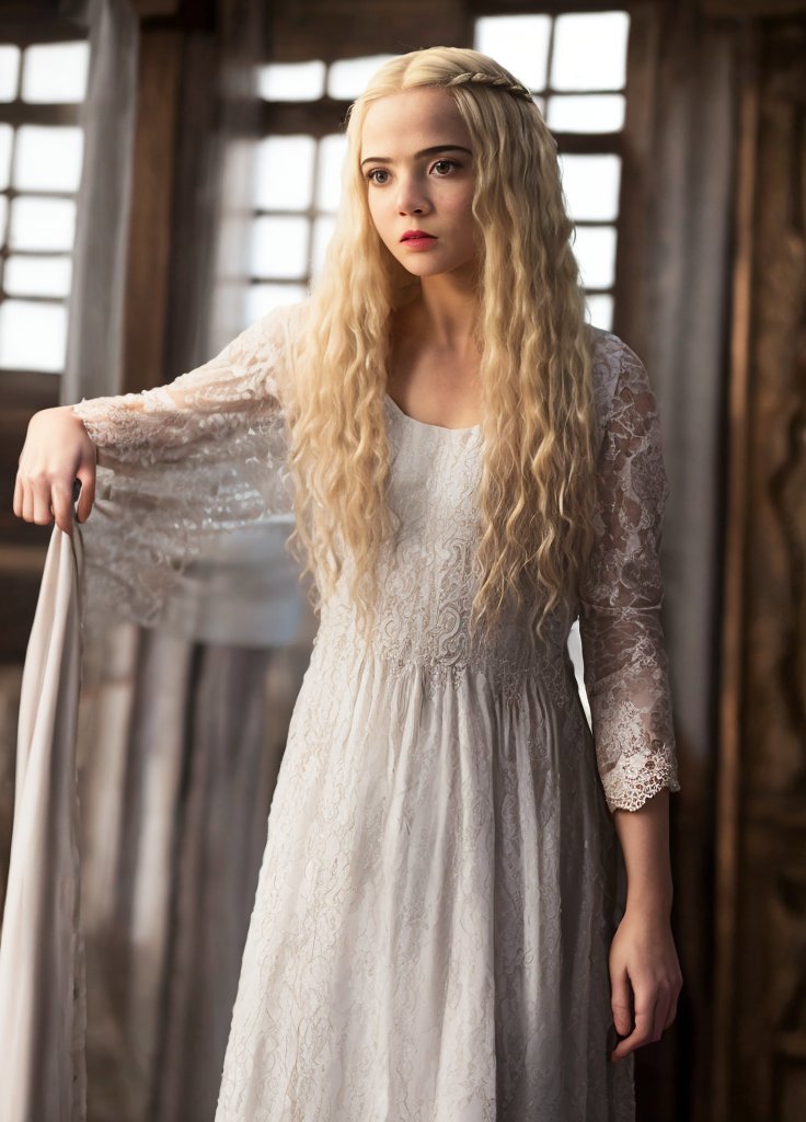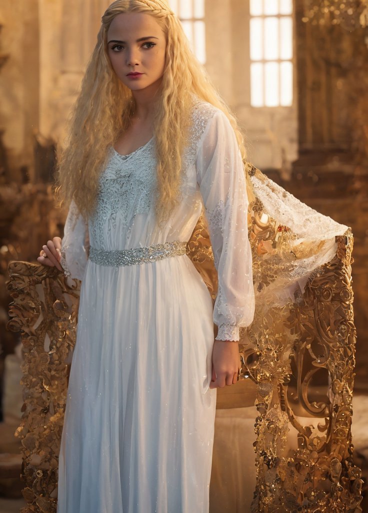 witcher-ciri, 1girl, green eyes, glowing eyes, blonde hair, curly hair, indoors, long hair, solo, white dress, small breasts,
