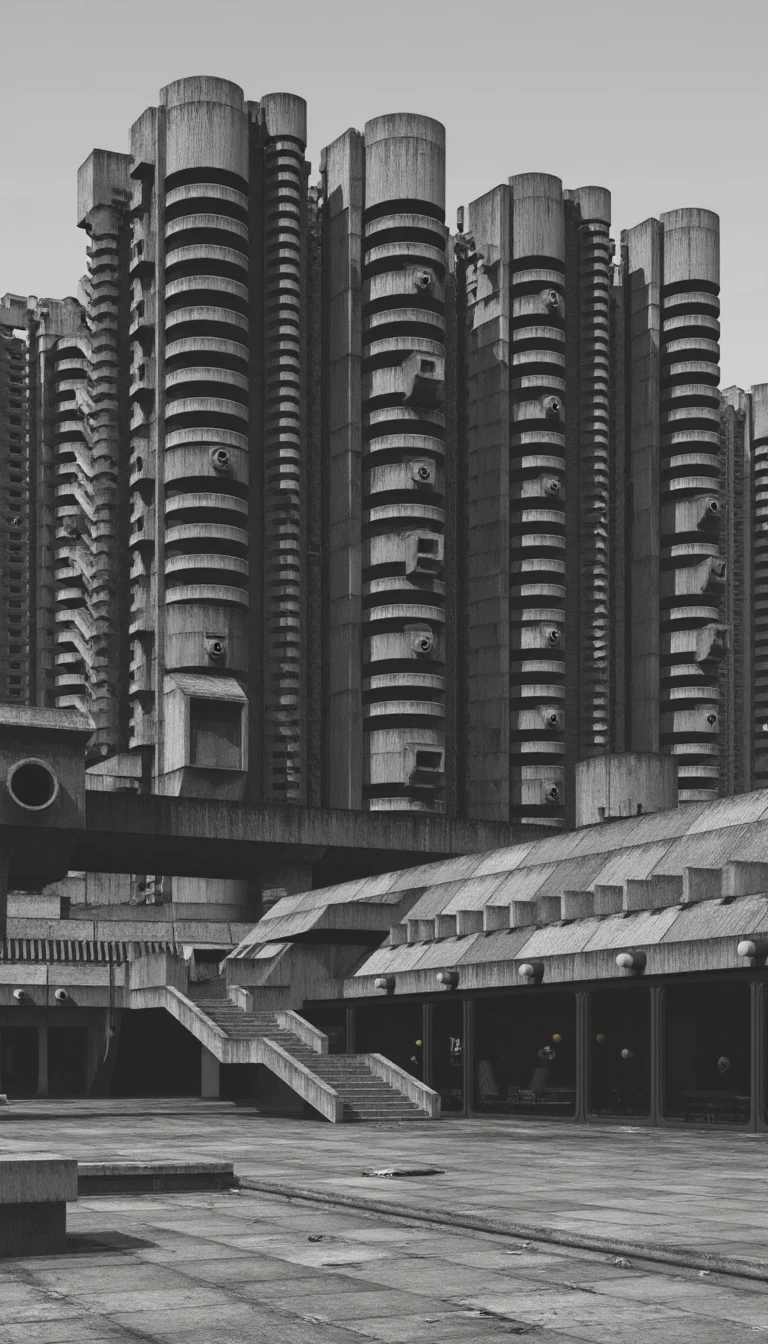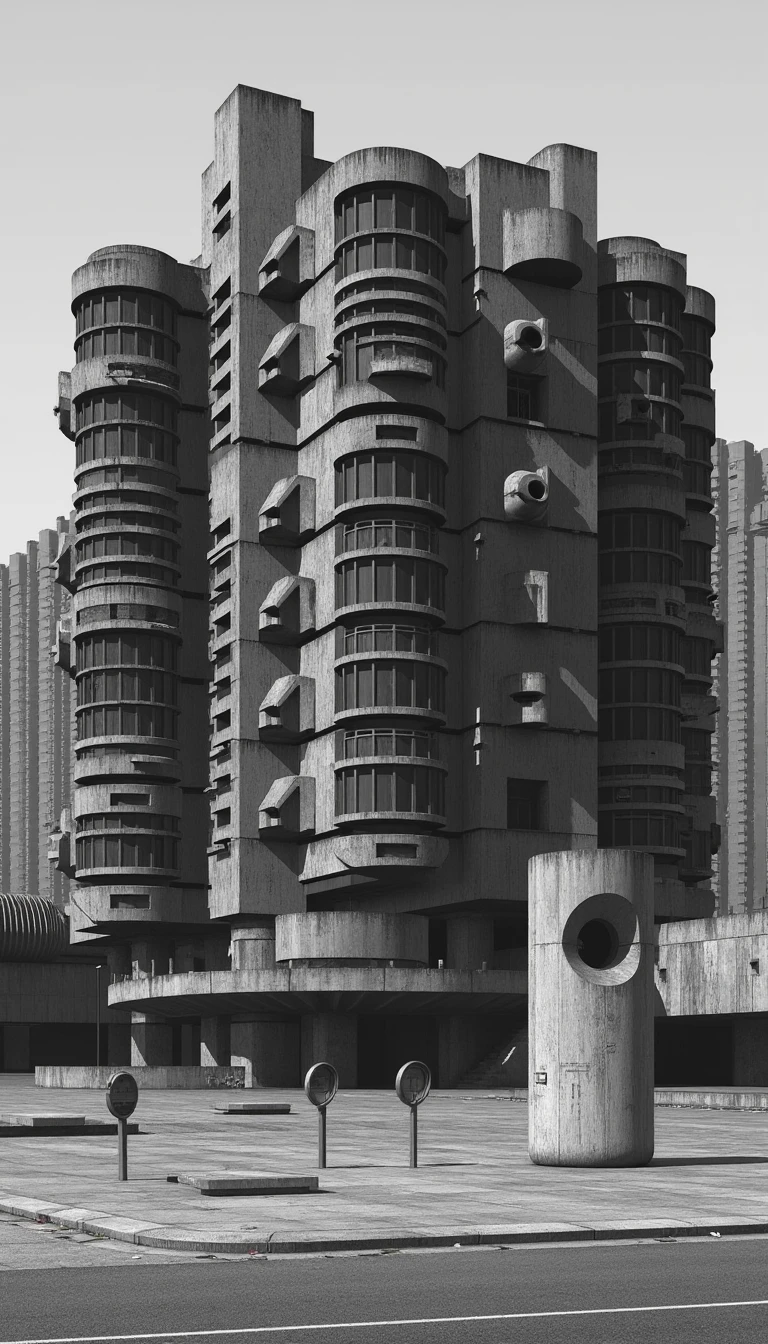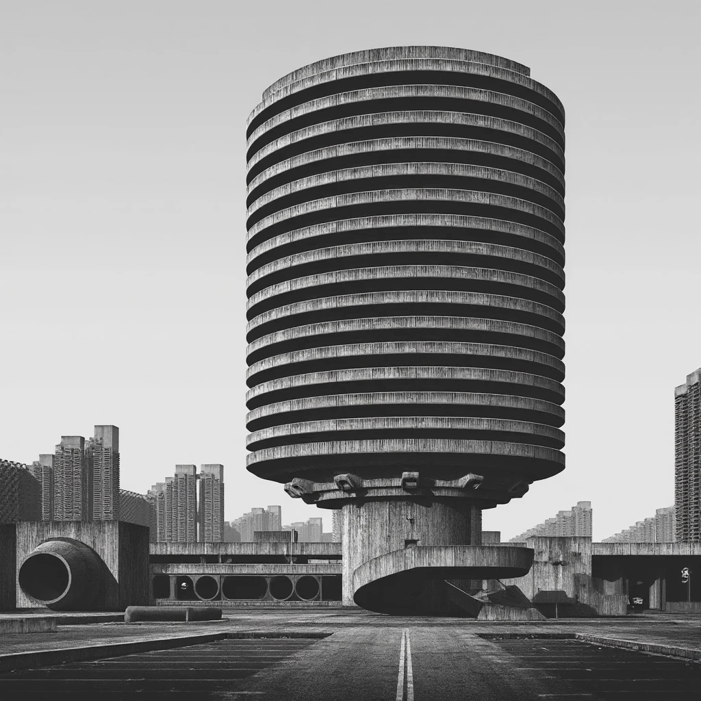 In the style of Clemens Gritl. Brutalism architecture with a 1960s black & white theme.