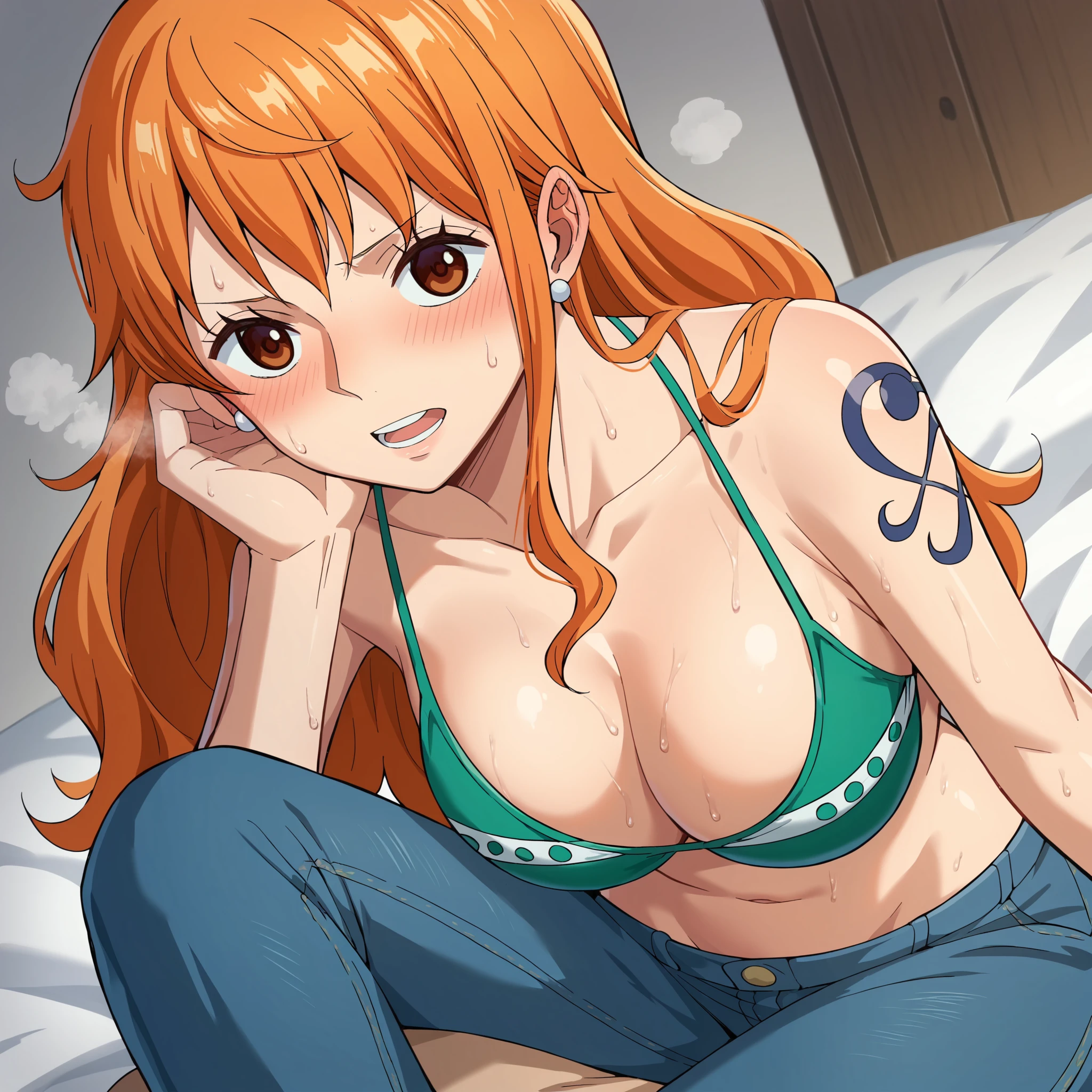 nami_post, orange hair, long hair, wavy hair, side locks, brown eyes, large breasts, shoulder tattoo