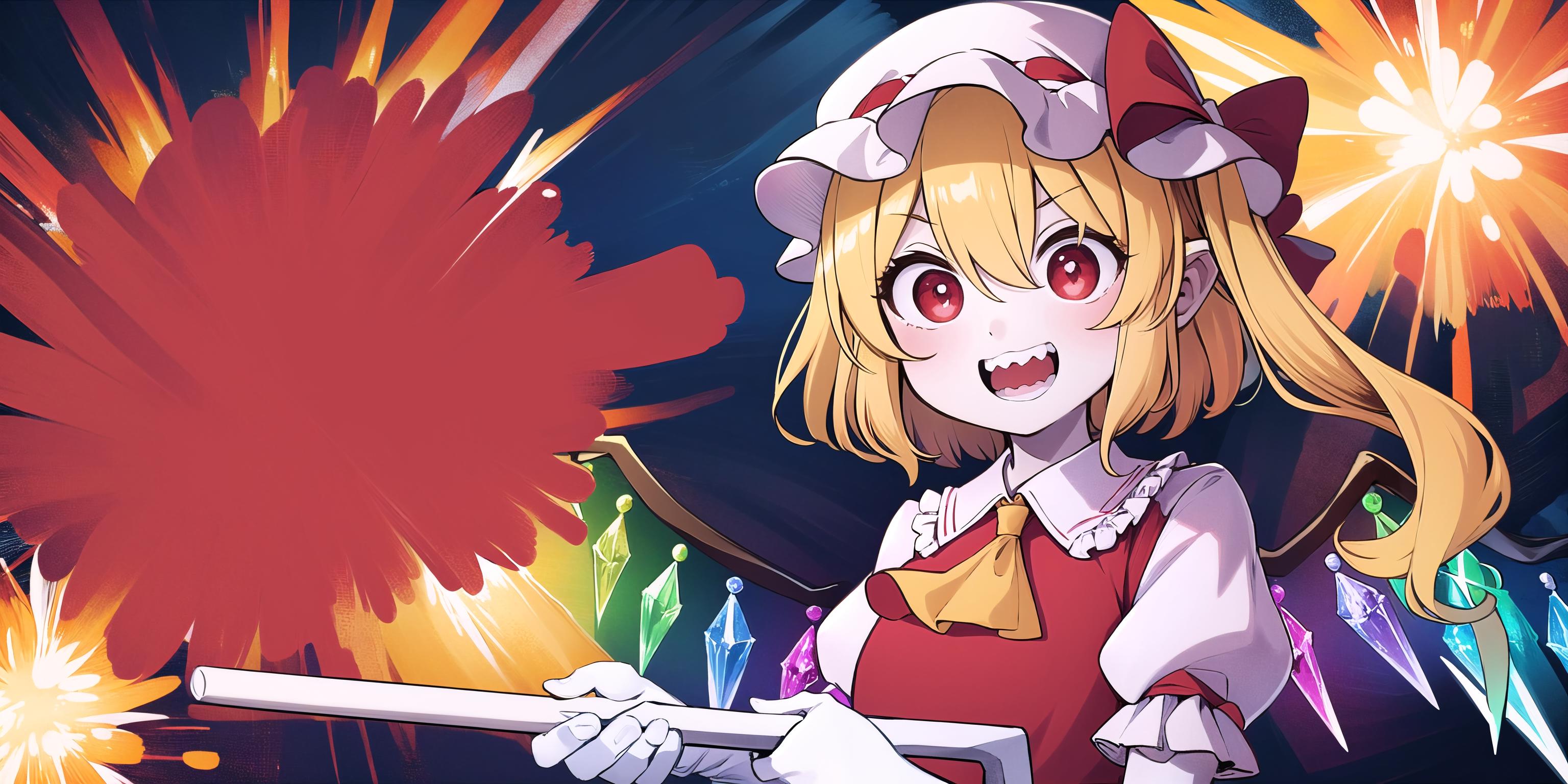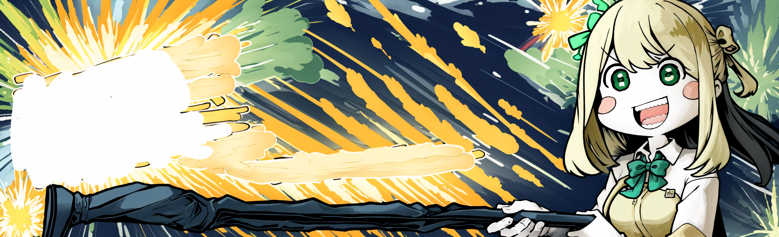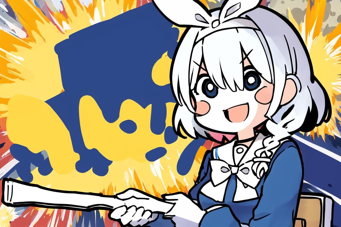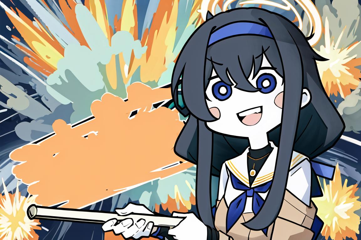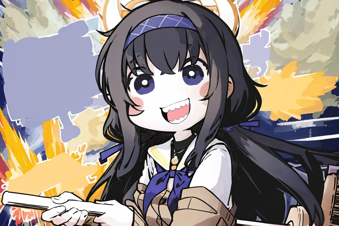 recommended prompt: yatte kita zo, smile, open mouth, teeth, holding, explosion