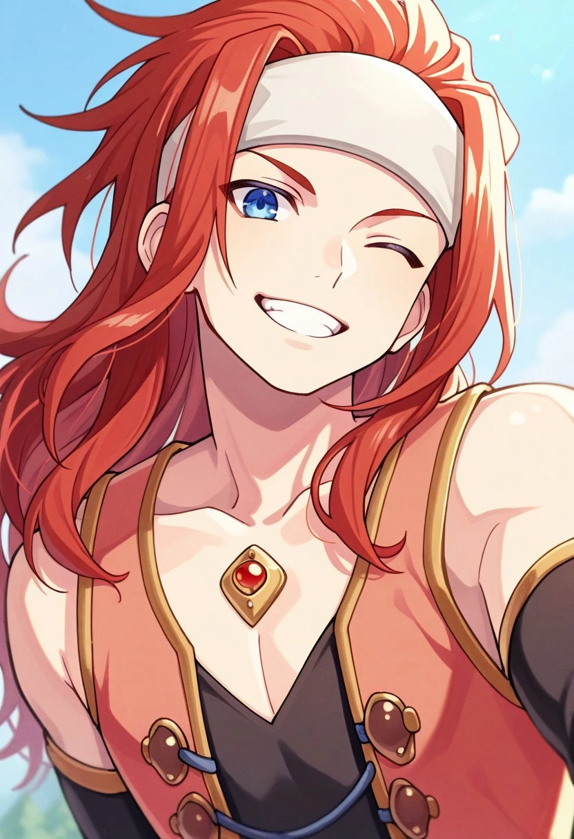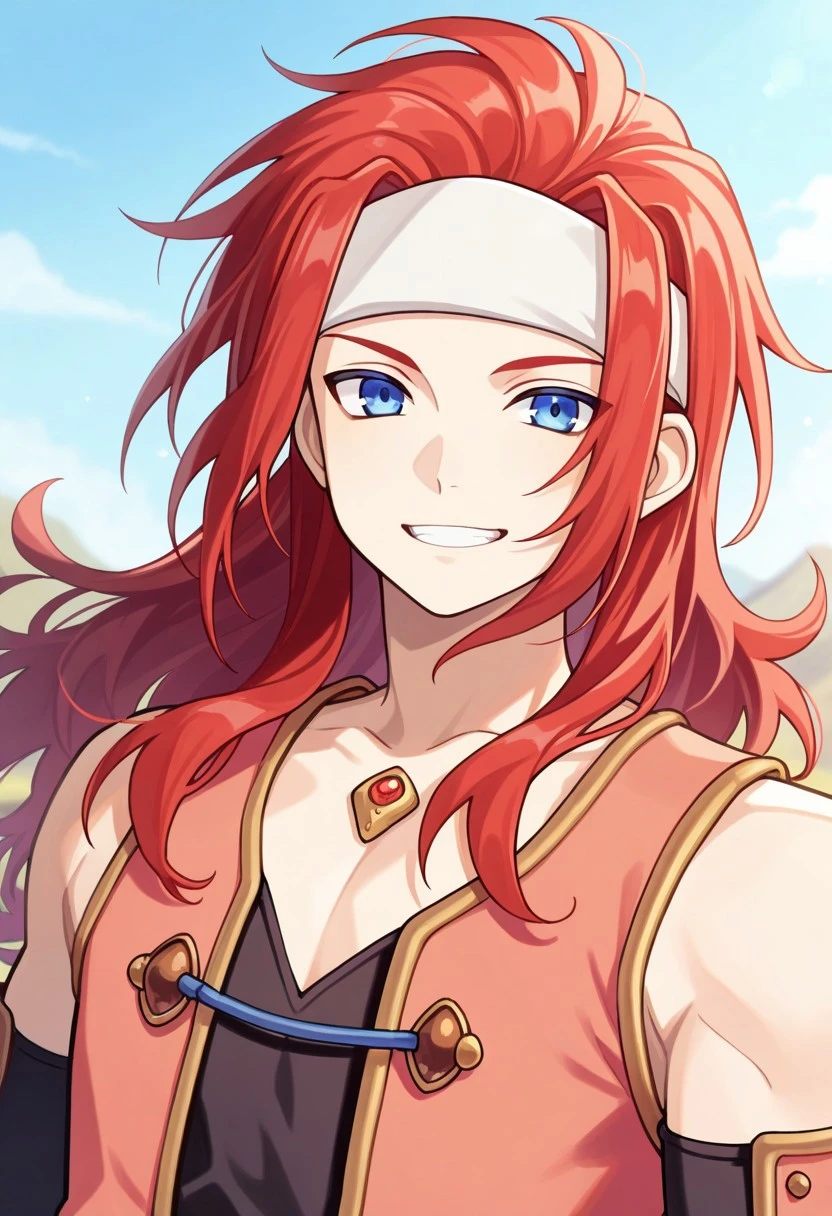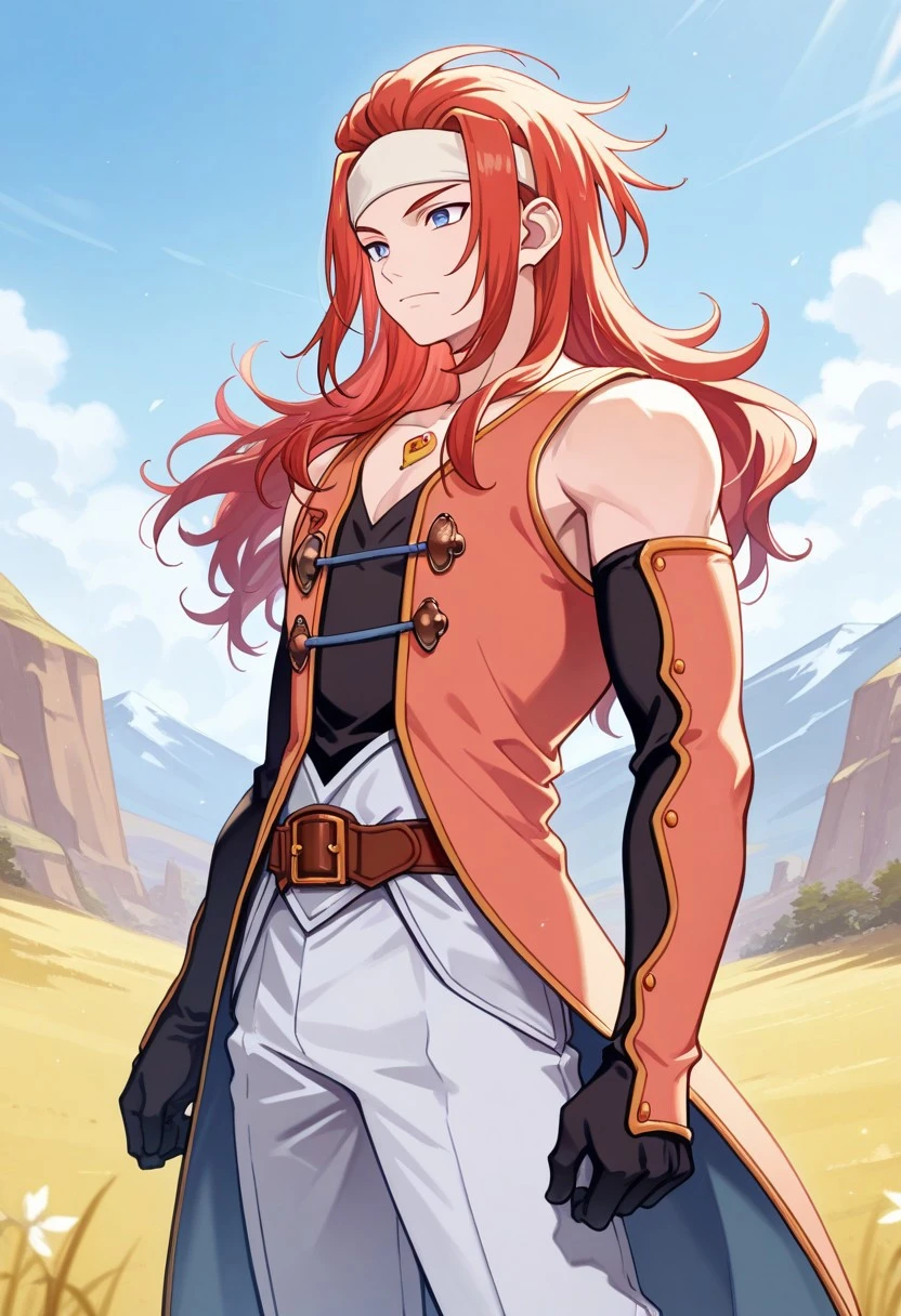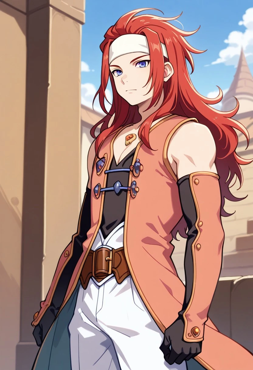 zelos, 1boy, male focus, solo, blue eyes, red hair, long hair, headband, shirt, black shirt, coat, pink coat, detached sleeves, jewelry, chest jewel, gloves, black gloves, belt, pants, white pants, shoes, white footwear