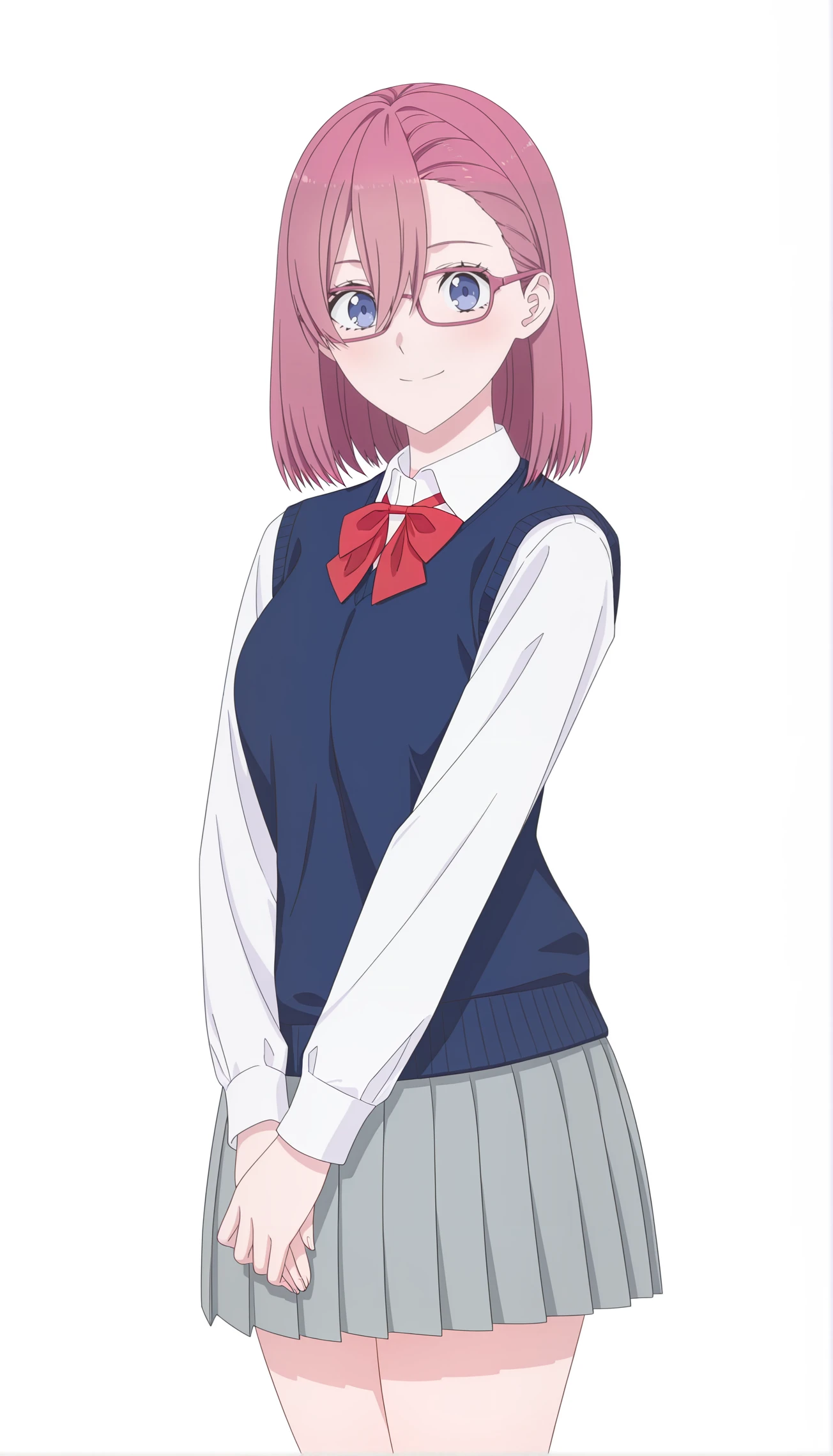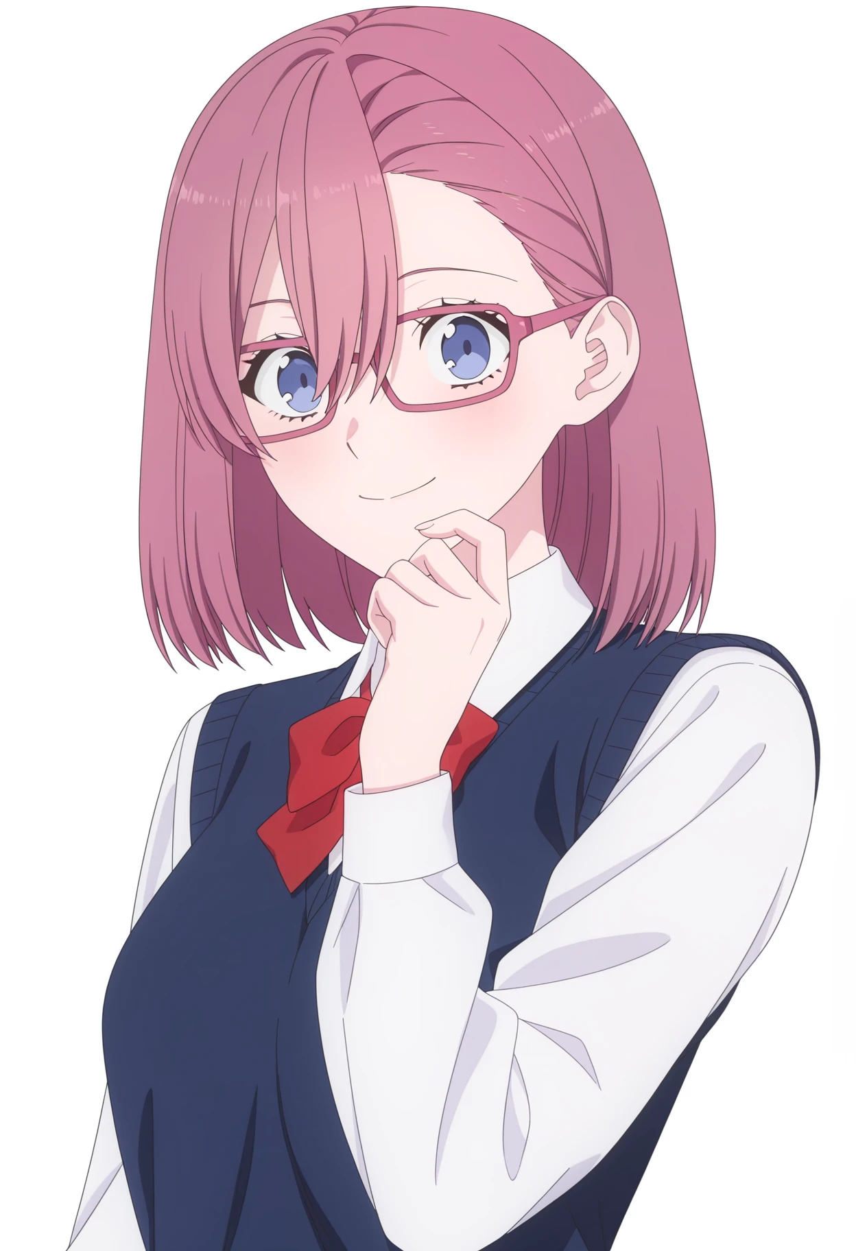 amano ririsa, 1girl, blue eyes, pink hair, glasses, medium breasts, school uniform, sweater vest, blue vest, long sleeves, red bow, skirt