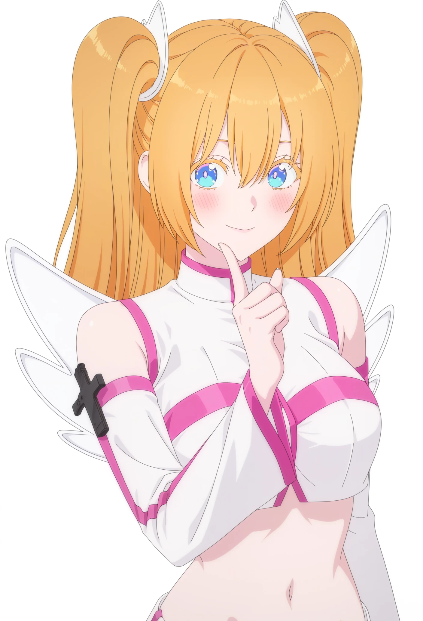 lilliel, 1girl, blonde hair, long hair, two side up, colored eyelashes, blue eyes, wings, croptop, bare shoulders, detached sleeves, midriff, navel, medium breasts, skirt, thighhighs
