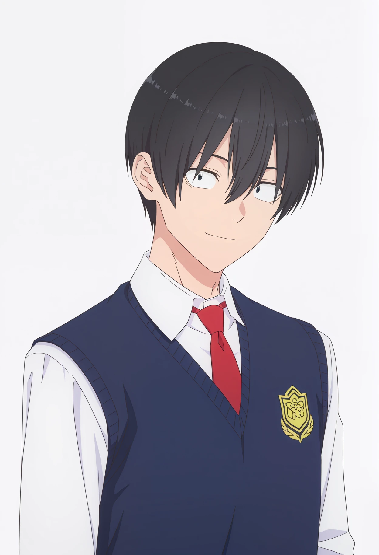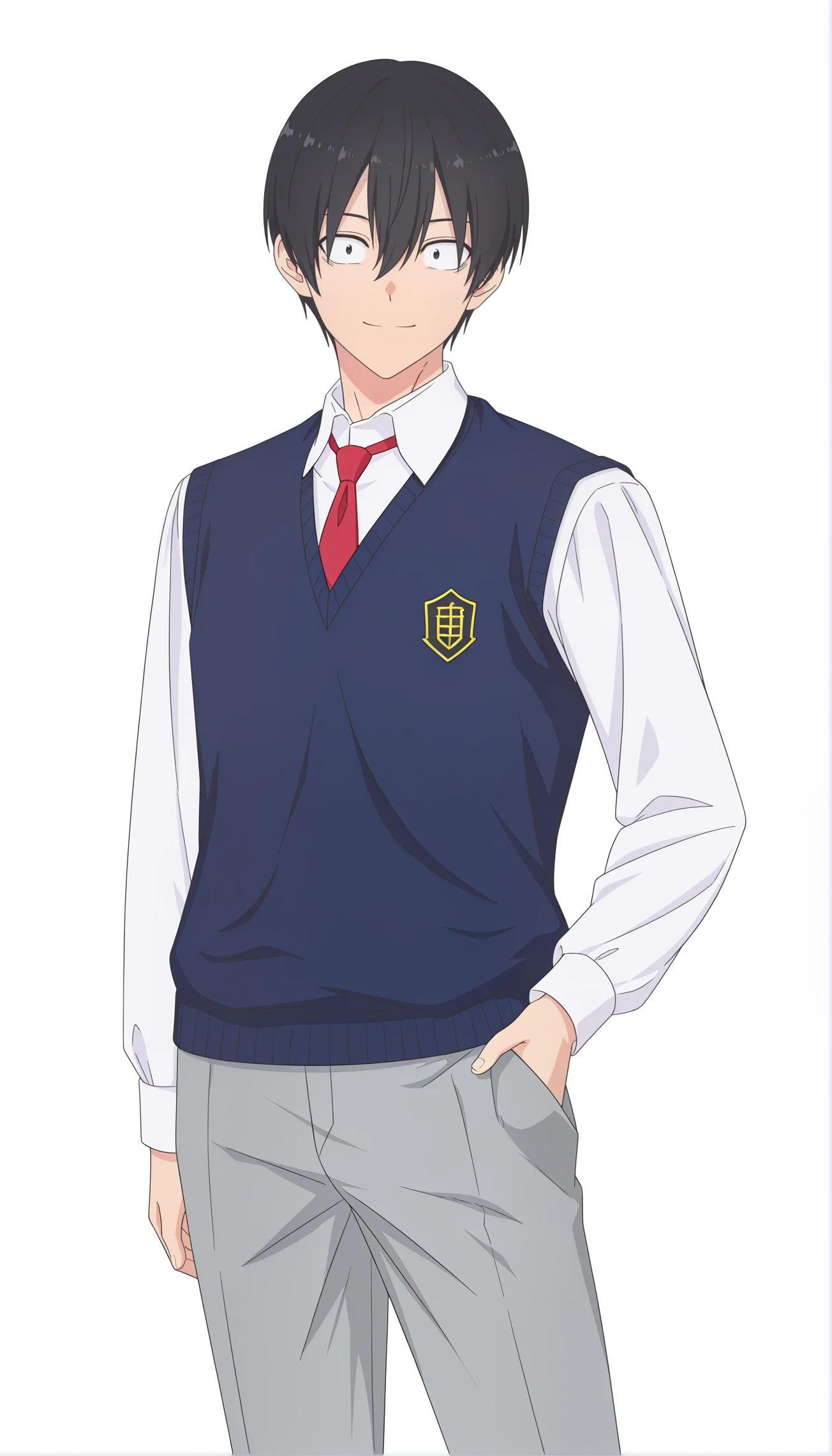 okumura masamune, 1boy, black hair, short hair, school uniform, sweater vest, blue vest, long sleeves, red necktie, pants