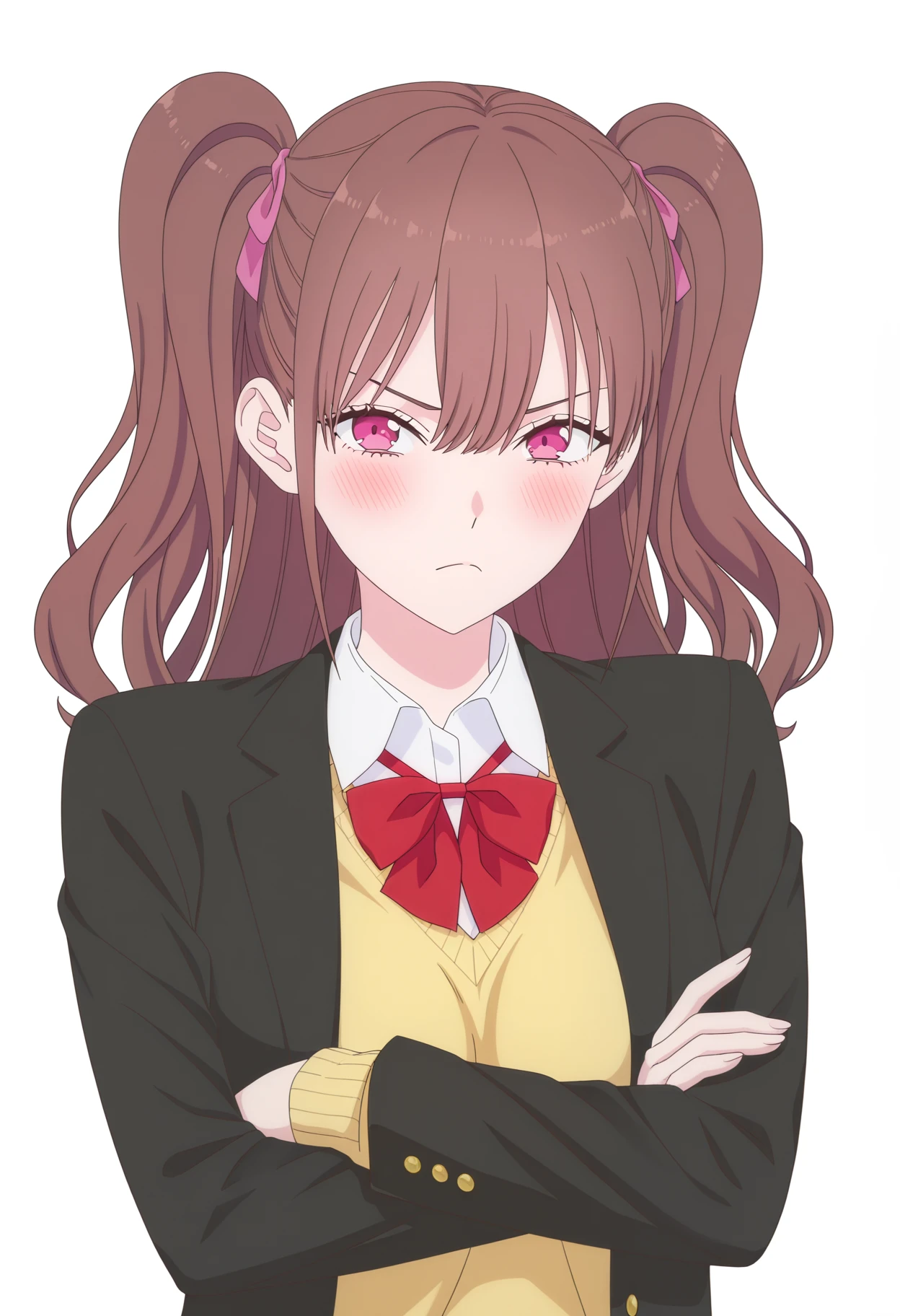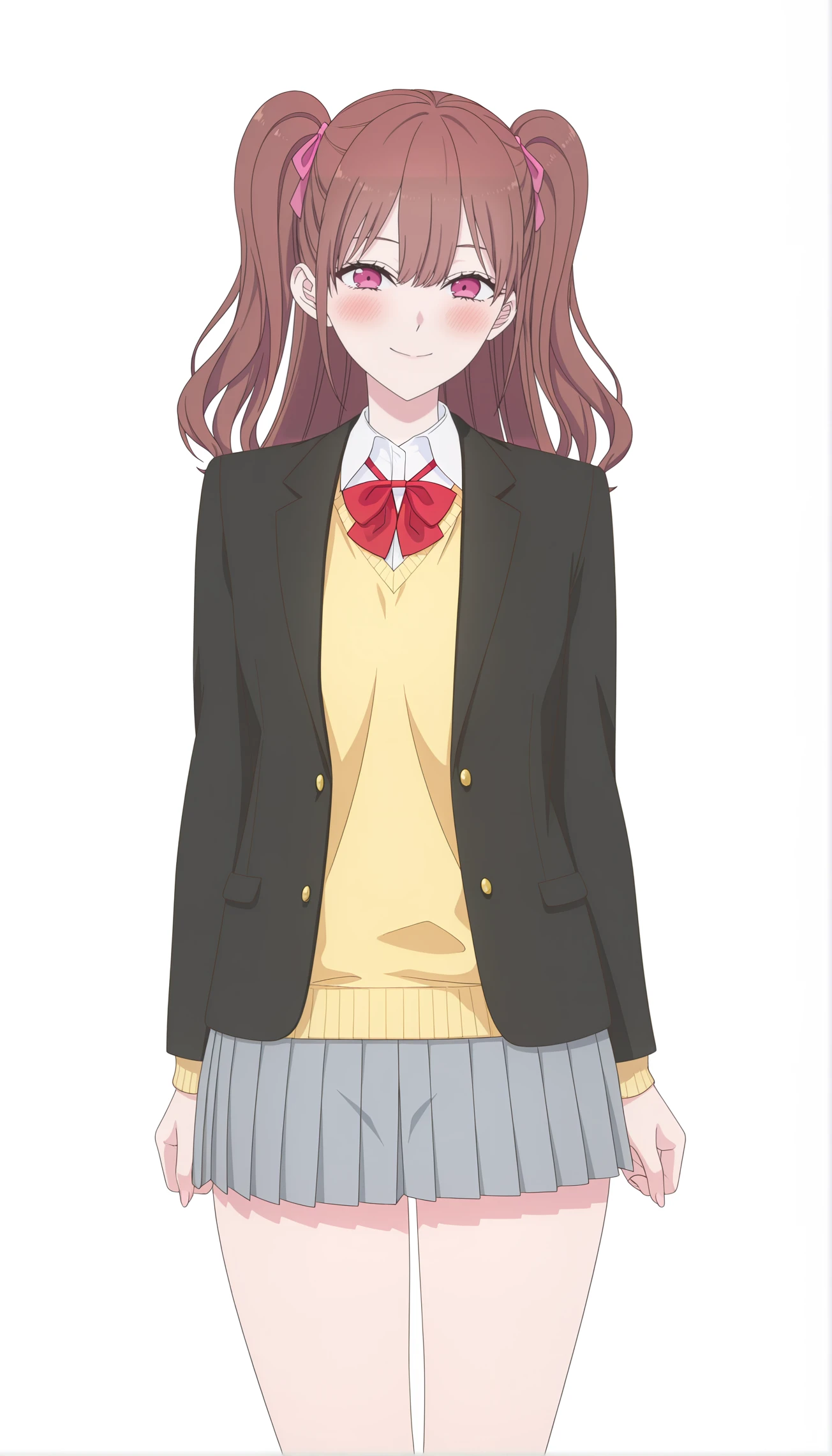 tachibana mikari, 1girl, brown hair, pink eyes, twintails, small breasts, school uniform, black jacket, open jacket, blazer, shirt, yellow cardigan, red bow, grey skirt, pleated skirt