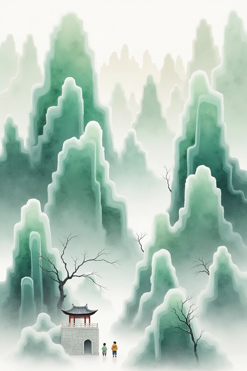 Traditional Chinese ink - wash landscape style, with towering green - white rock formations, scattered pagodas, sparse trees, and a hazy atmosphere for a tranquil mood.