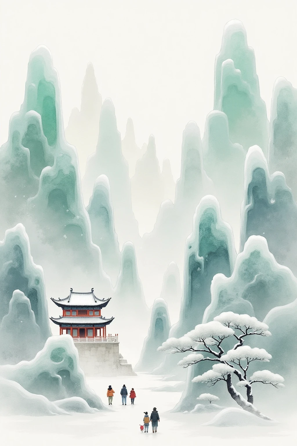 Traditional Chinese ink - wash landscape style, with tall, straight peaks, a multi - tiered pagoda, a group of travelers, and a light snowfall, evoking a sense of adventure.