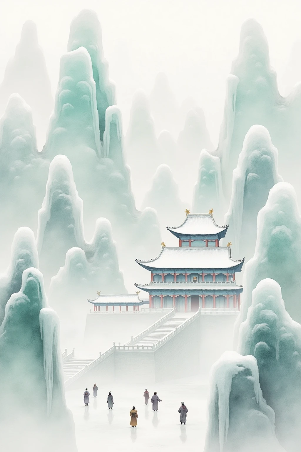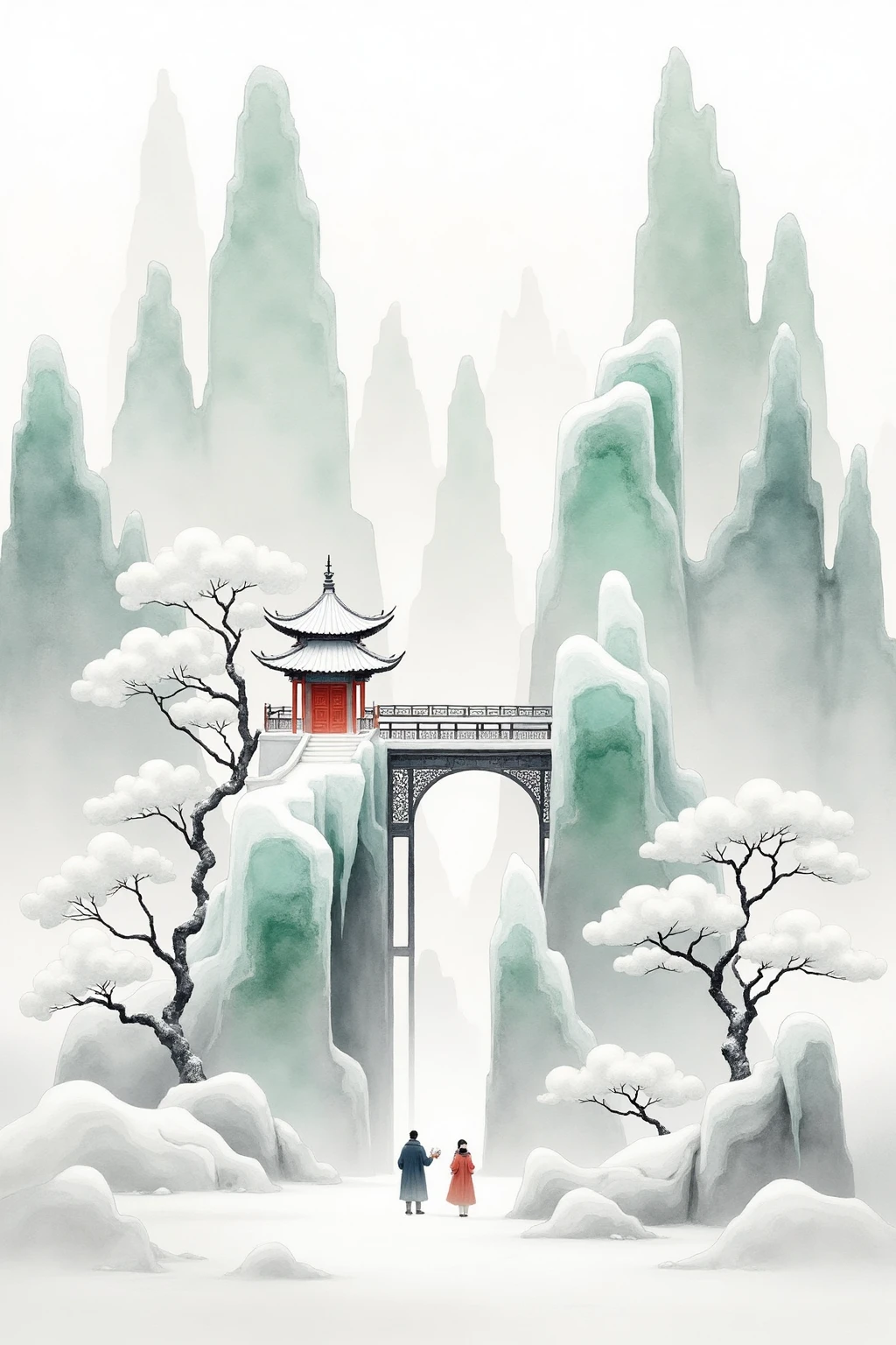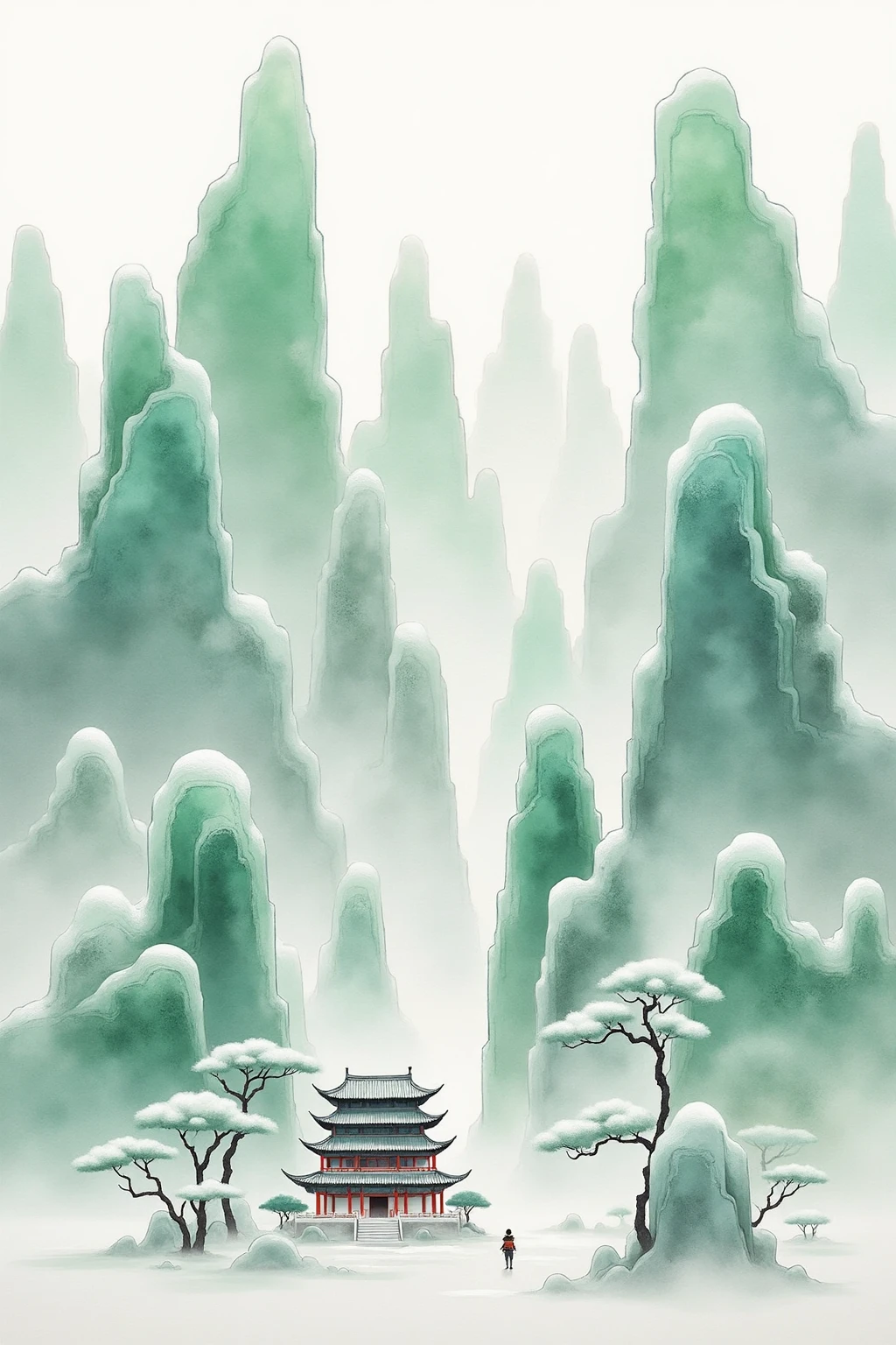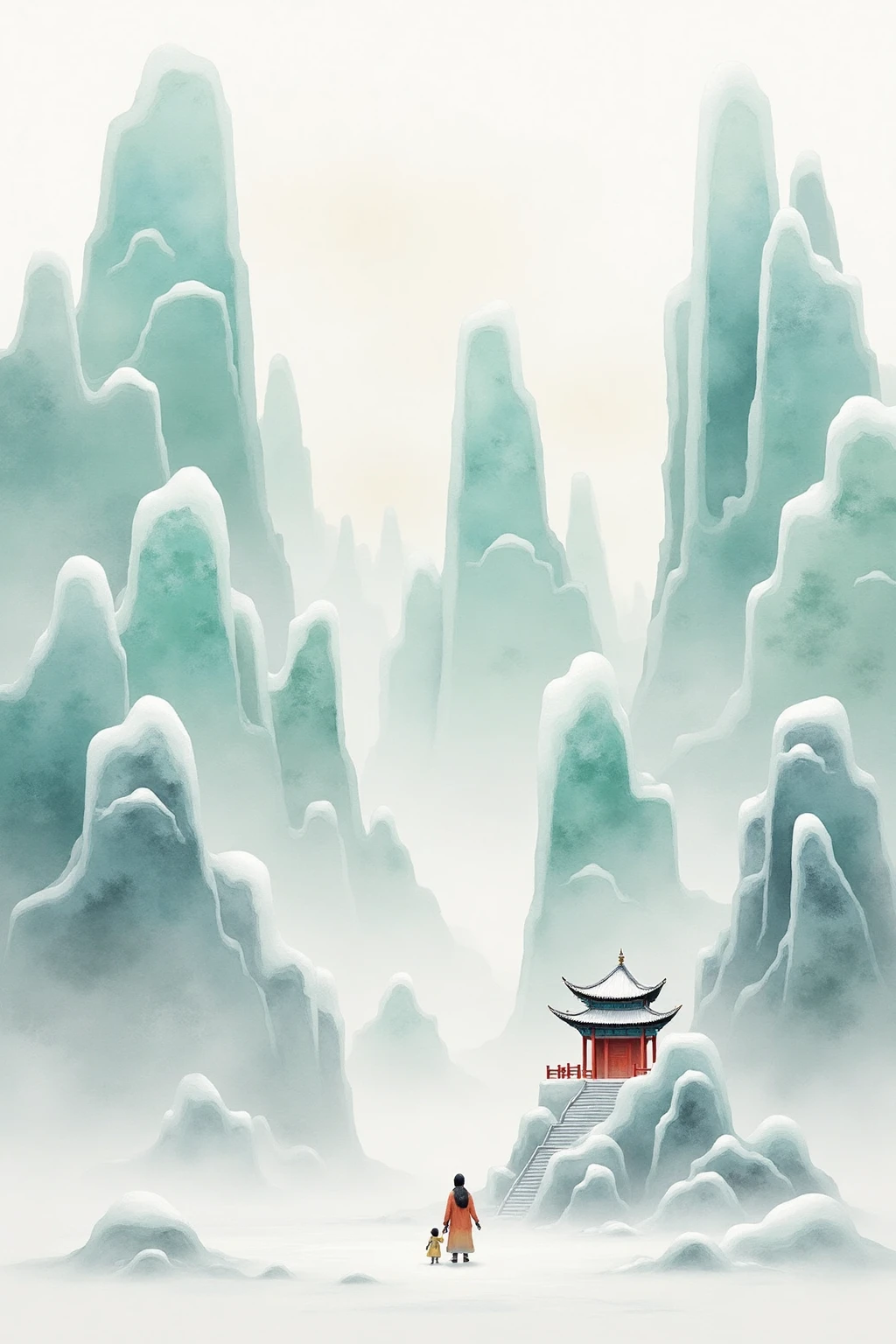 Traditional Chinese ink - wash landscape style, including tall icy peaks, a small red - roofed pavilion, a single traveler, and mist, to build a lonely yet beautiful vibe.