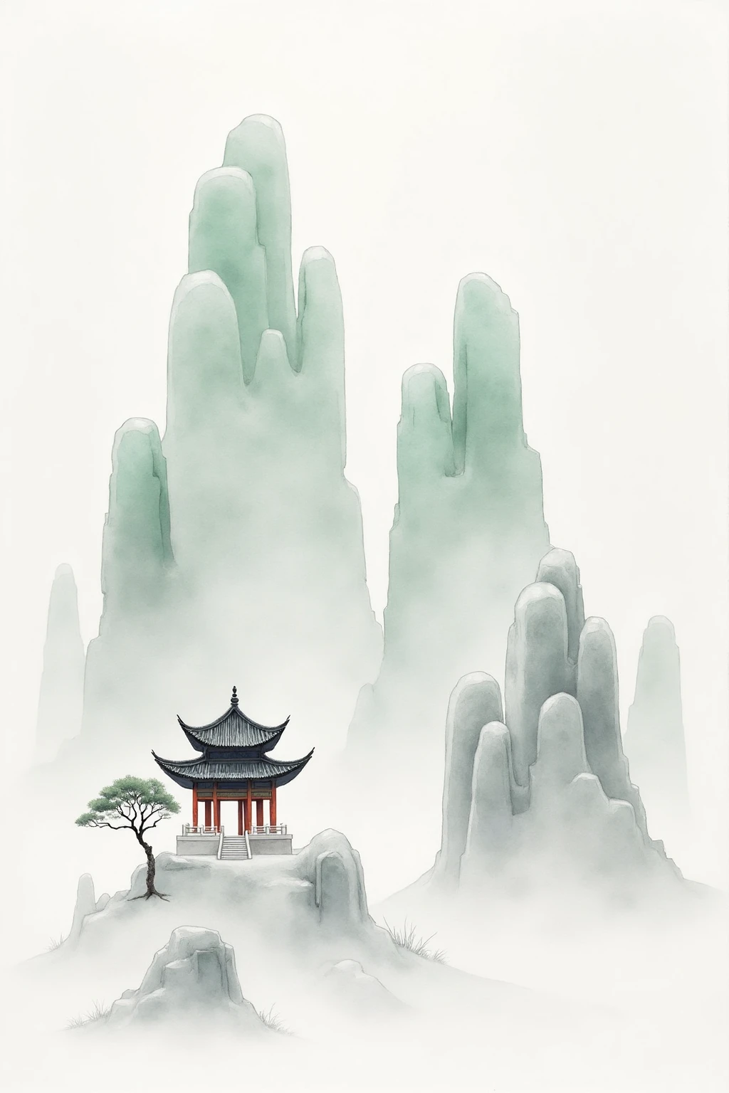Traditional Chinese ink - wash landscape style, including clustered rock formations, a small square pavilion, a lone tree, and mist, to form a minimalist and serene view.