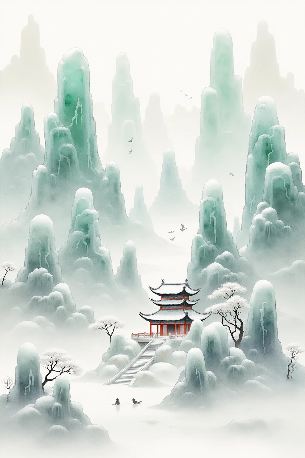 Traditional Chinese ink - wash landscape style, featuring slender rock towers, a hidden pavilion, a few birds, and light snow, for an elegant and peaceful look.