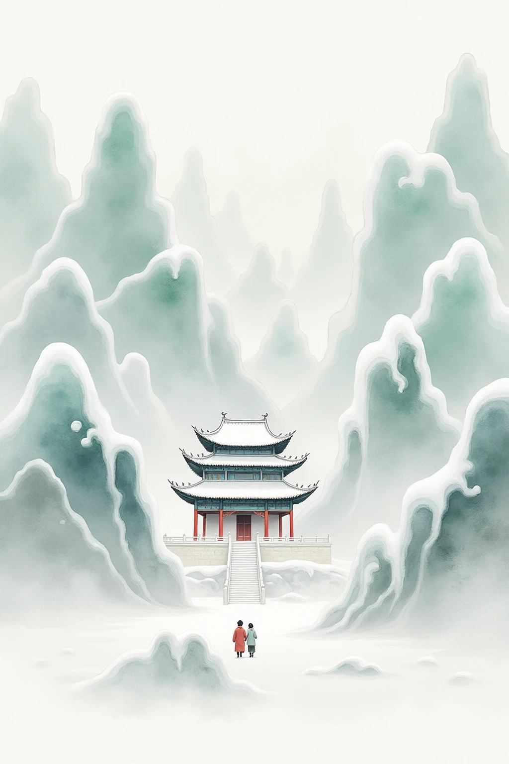 Traditional Chinese ink - wash landscape style, showing layered mountains, a grand multi - story pavilion, light snow covering, and a couple strolling, evoking peace.
