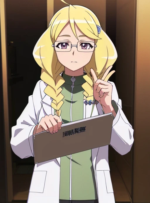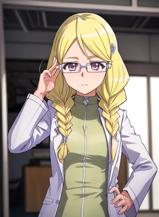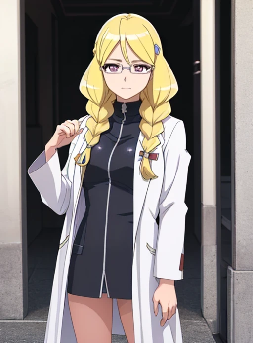tatsuno riasu, blonde hair, glasses, long hair, hairclip, labcoat, purple eyes, braid