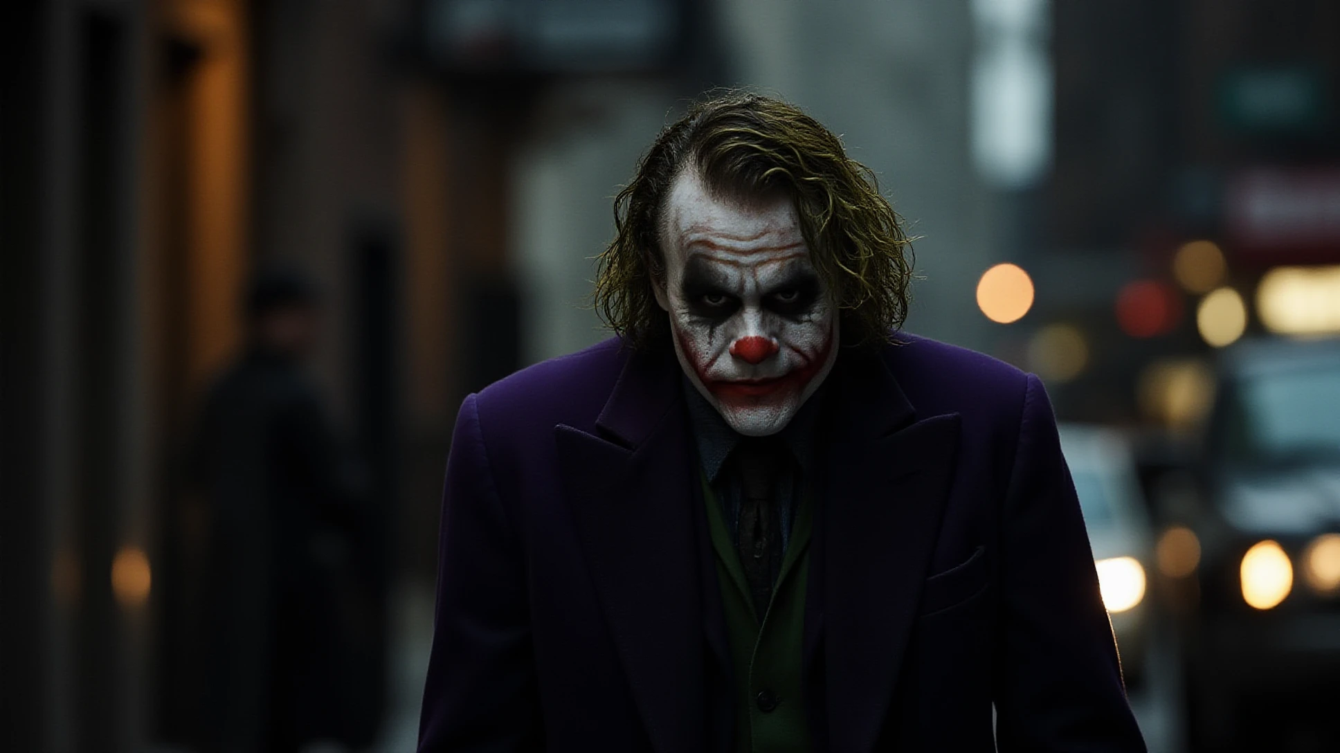 HTHLDGRJKR Heath Ledger as the Joker in the Dark Knight trilogy, wearing a purple coat and with a blurred background.