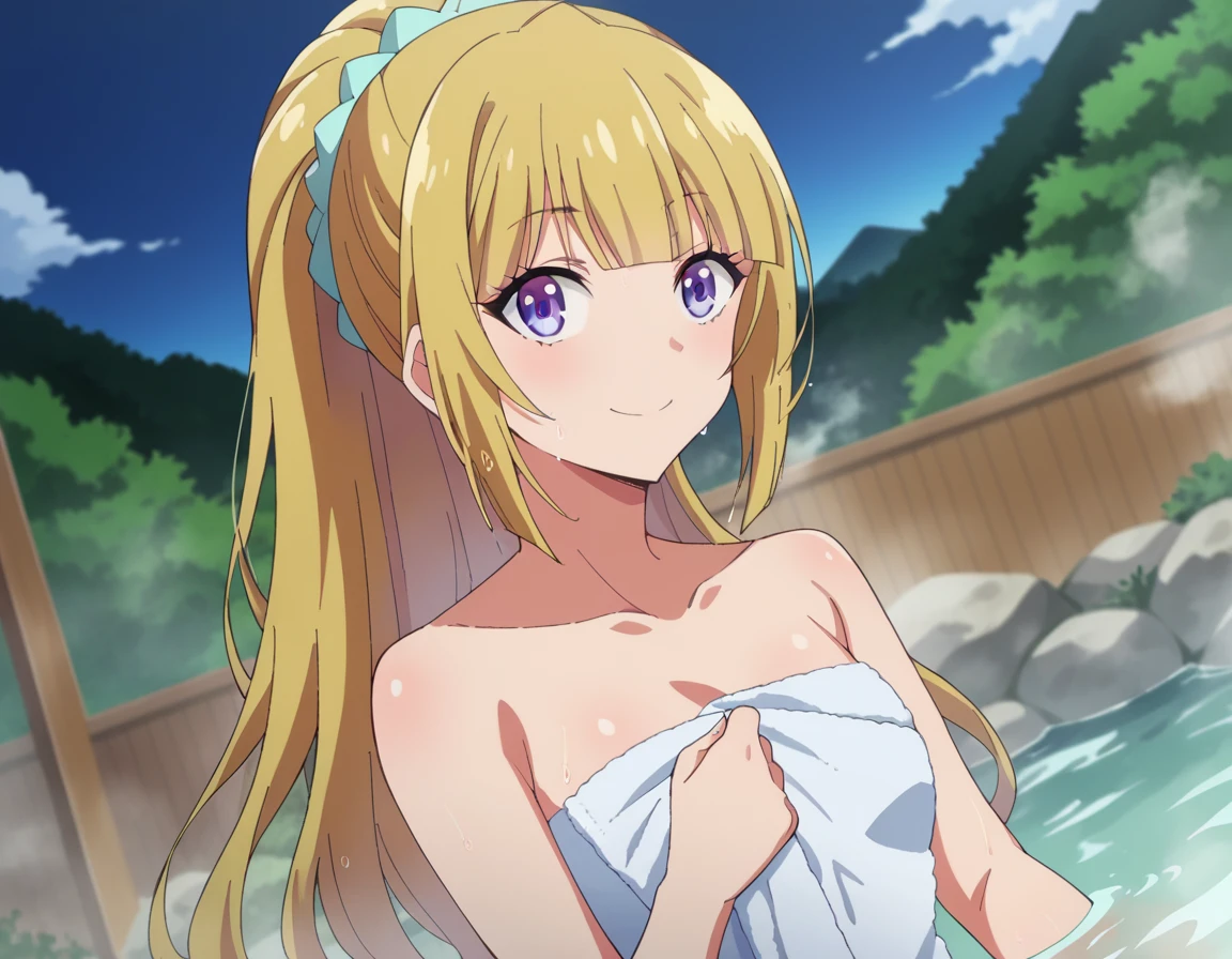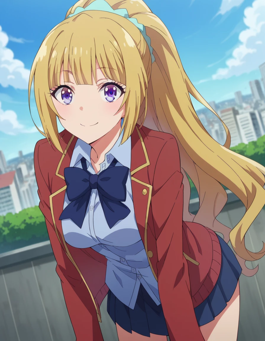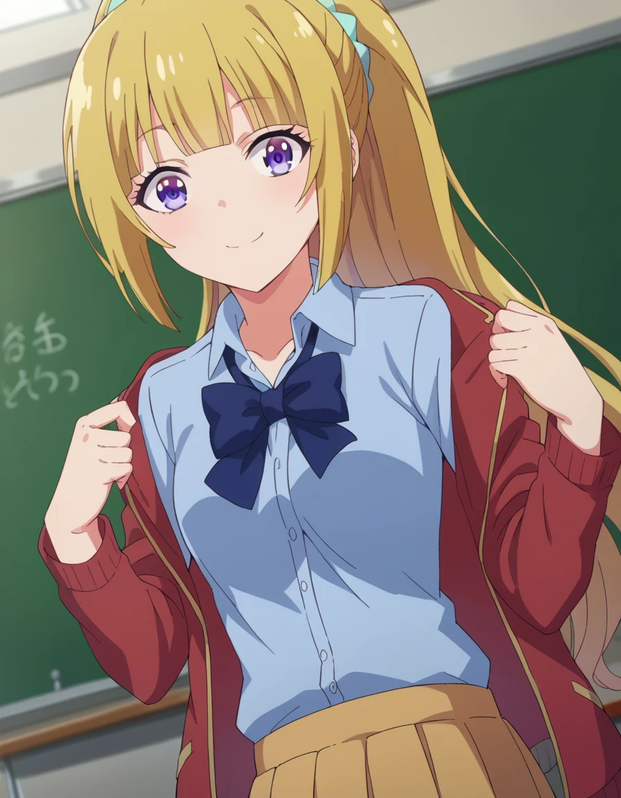 kei karuizawa, long hair, bangs, blunt bangs, purple eyes, blonde hair, hair ornament, ponytail, scrunchie, blue scrunchie,