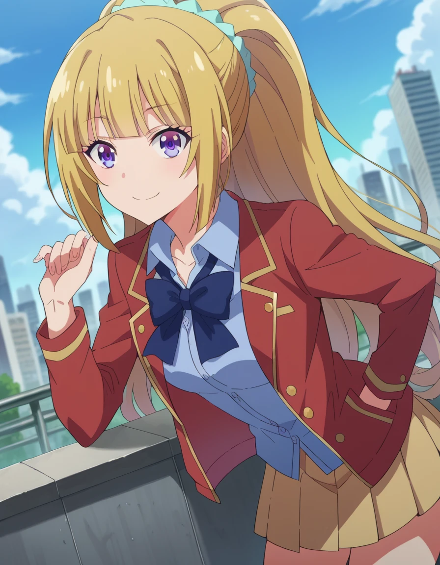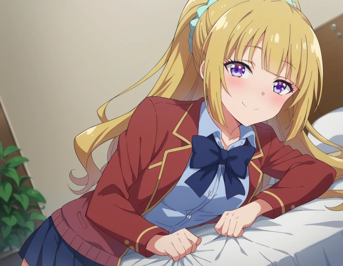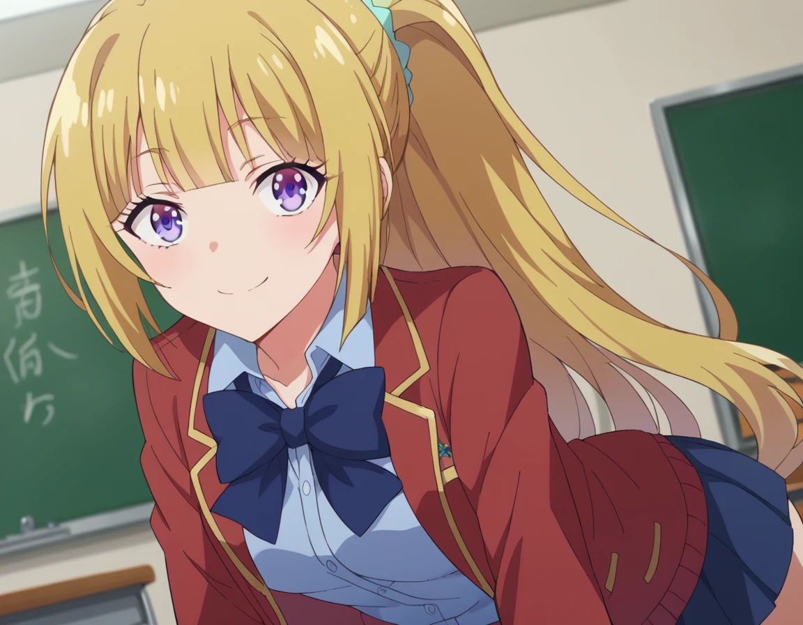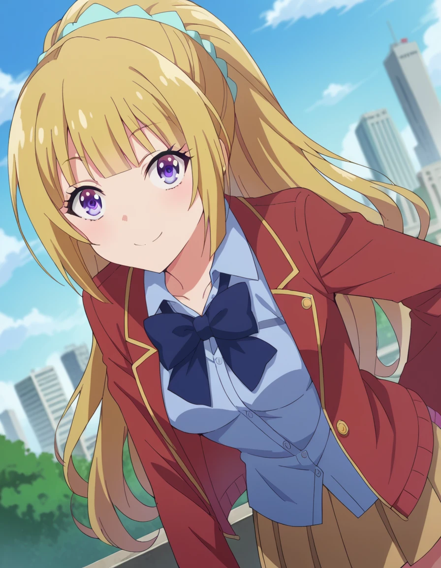 kei karuizawa, long hair, bangs, blunt bangs, purple eyes, blonde hair, hair ornament, ponytail, scrunchie, blue scrunchie,