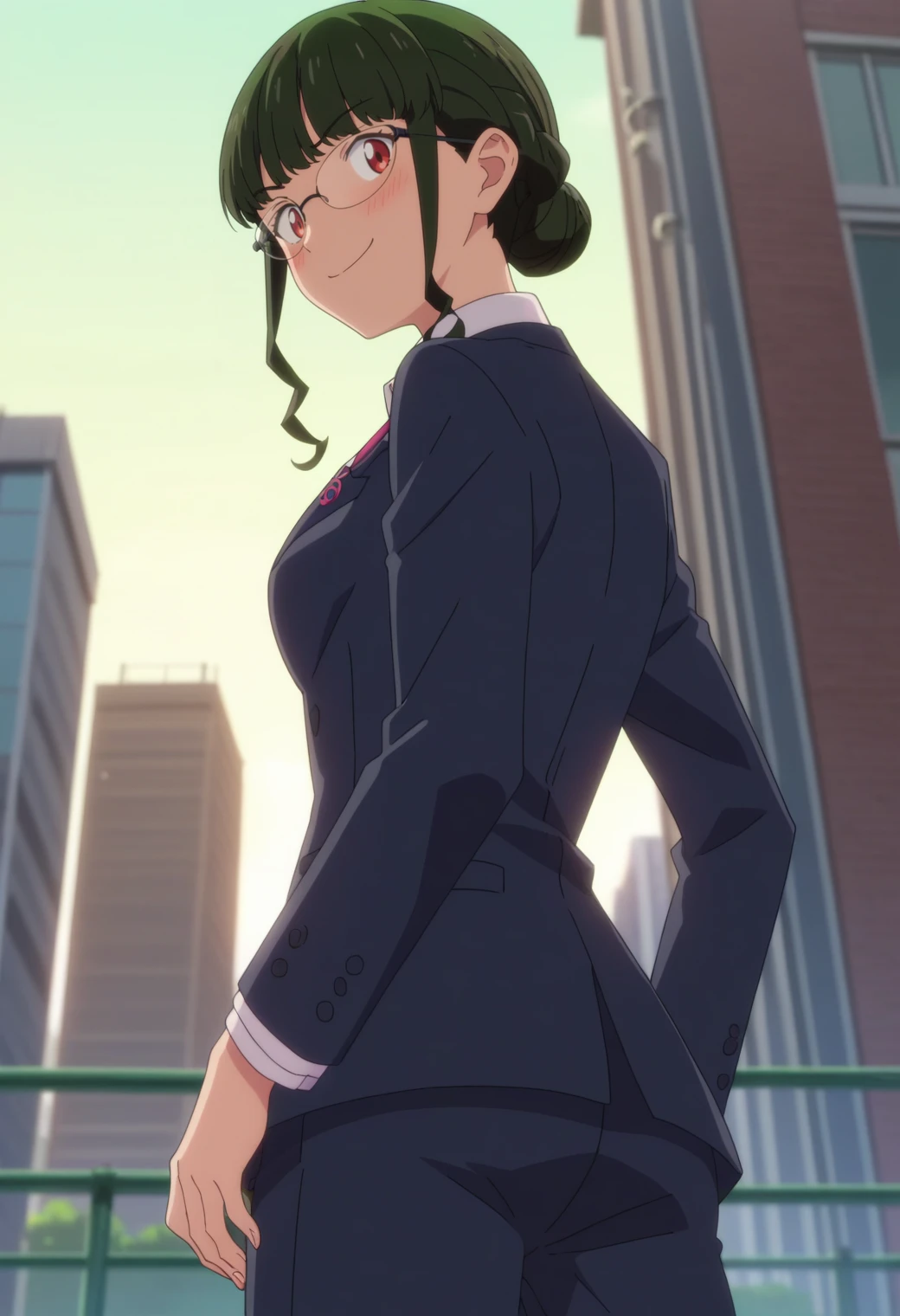 KJOanosillus, green hair, red eyes, sidelocks, single hair bun, blunt bangs, glasses,