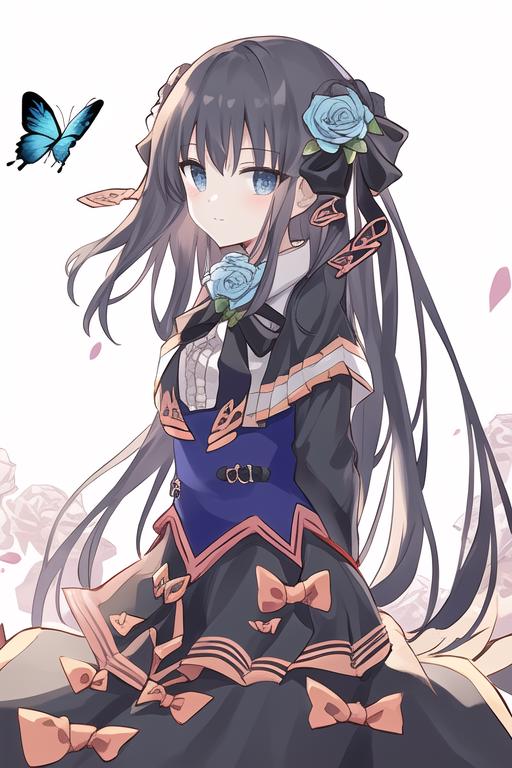 example: tairitsu,rose, flower, pink rose, 1girl, butterfly, bouquet, solo, white rose, yellow rose, ribbon, long sleeves, red rose, white flower, purple rose, puffy sleeves, shirt, blue flower, blue rose, flower, blue bow,floating hair, long hair,dress, black hair,hair ornament, purple rose, looking at viewer,
