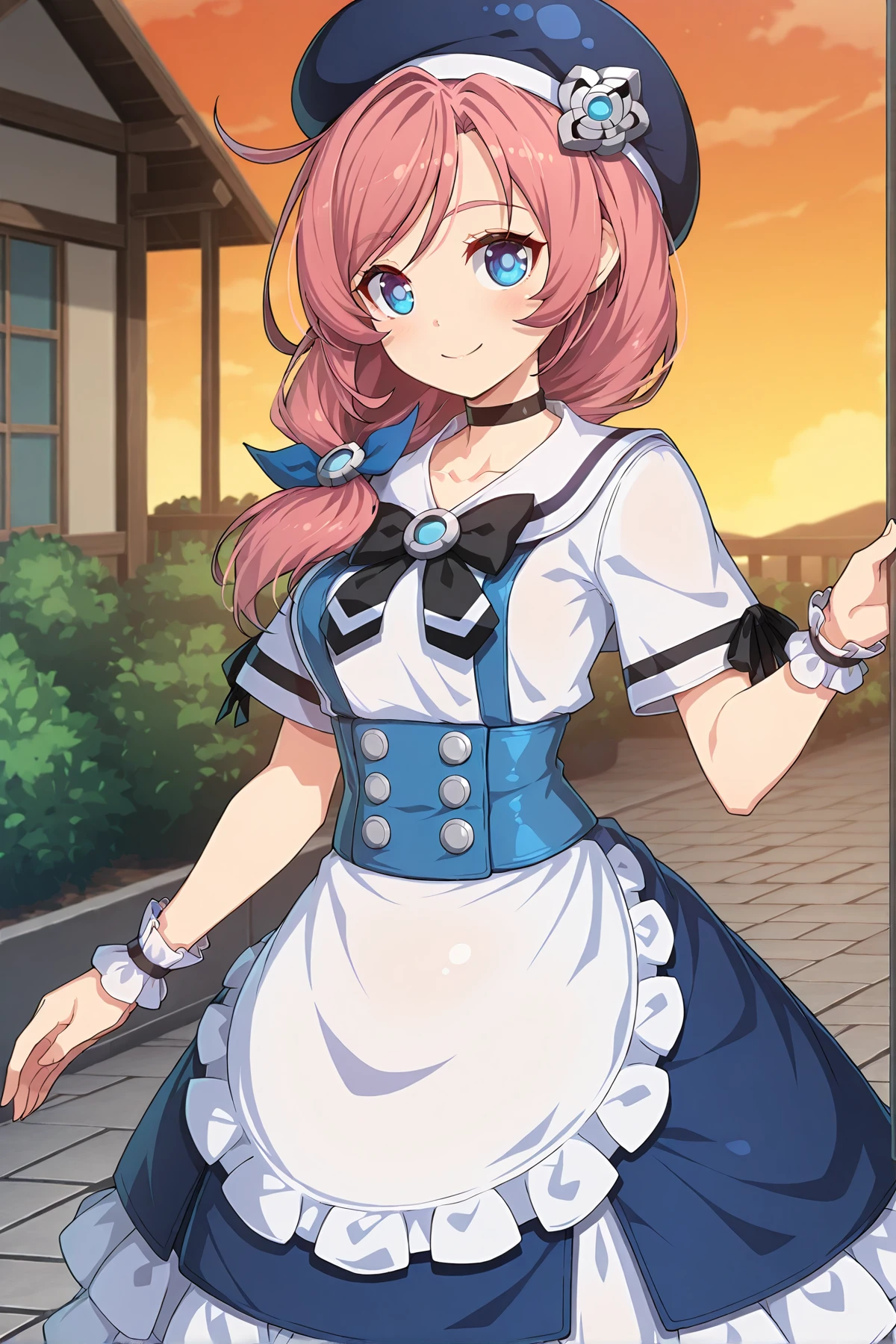 blue eyes, pink hair, low-tied hair, navy blue beret, choker, white shirt, short sleeves, blue corset, white apron, white frill wrist cuffs, white frill skirt, white socks, black loafers