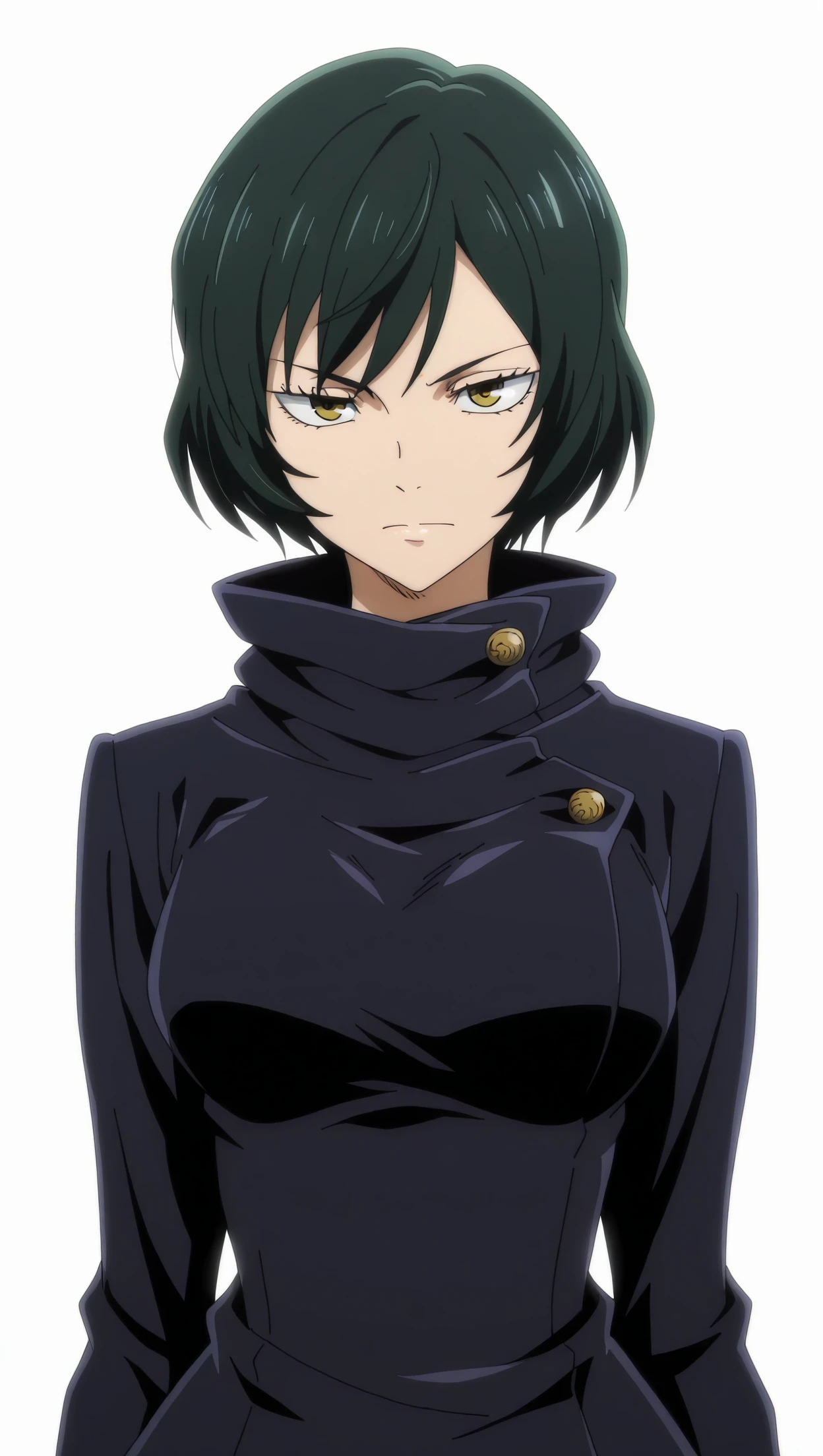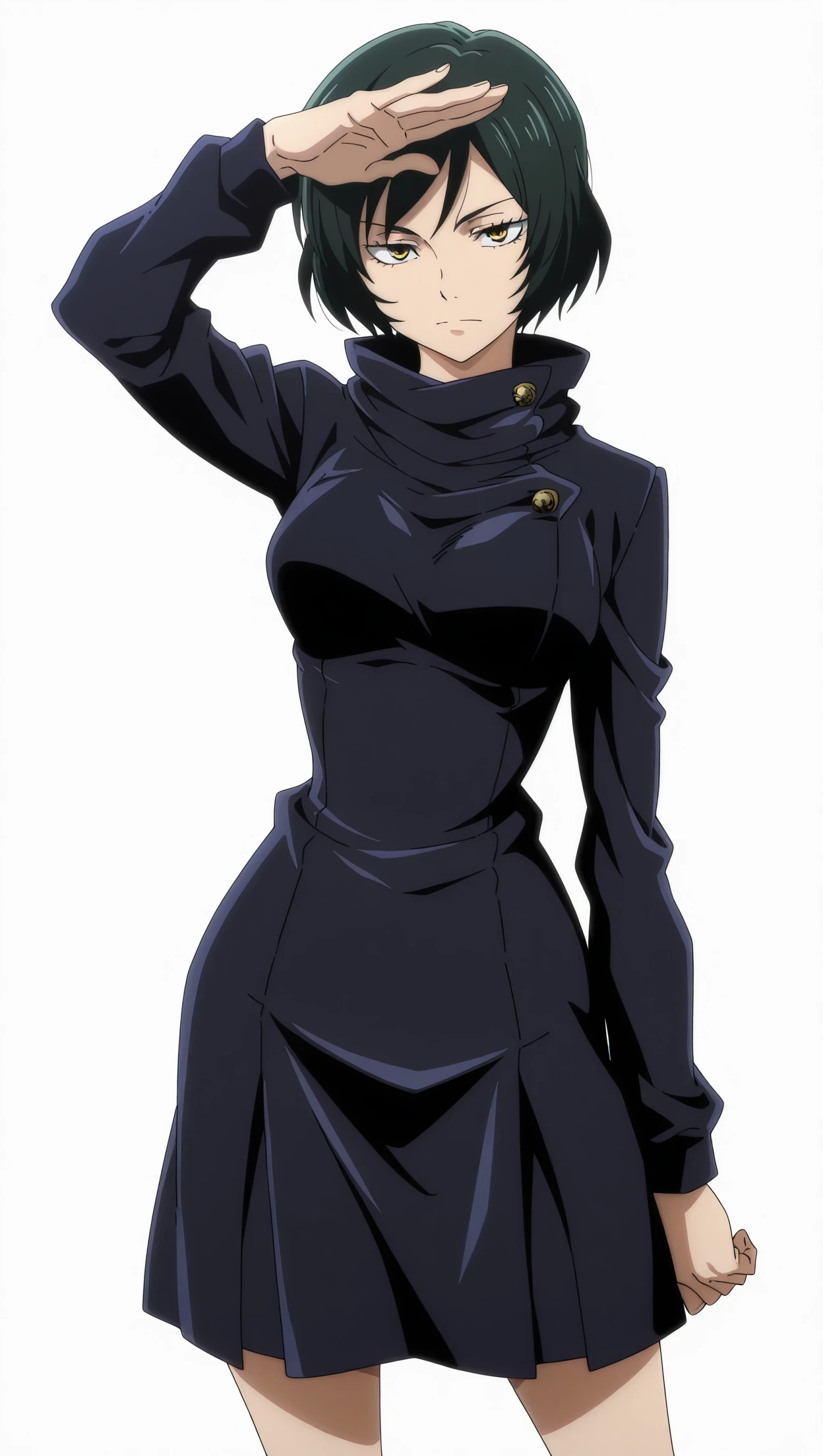 anime coloring, masterpiece, best quality, amazing quality, mai, 1girl, short hair, green hair, yellow eyes, medium breasts, school uniform, dress, black dress, long sleeves, turtleneck, solo, pose, standing, looking at viewer, white background, simple background