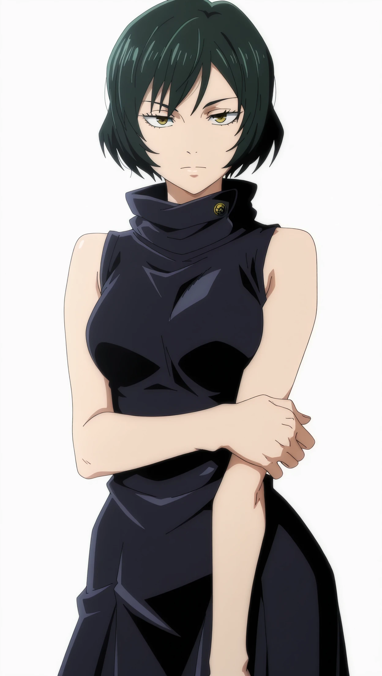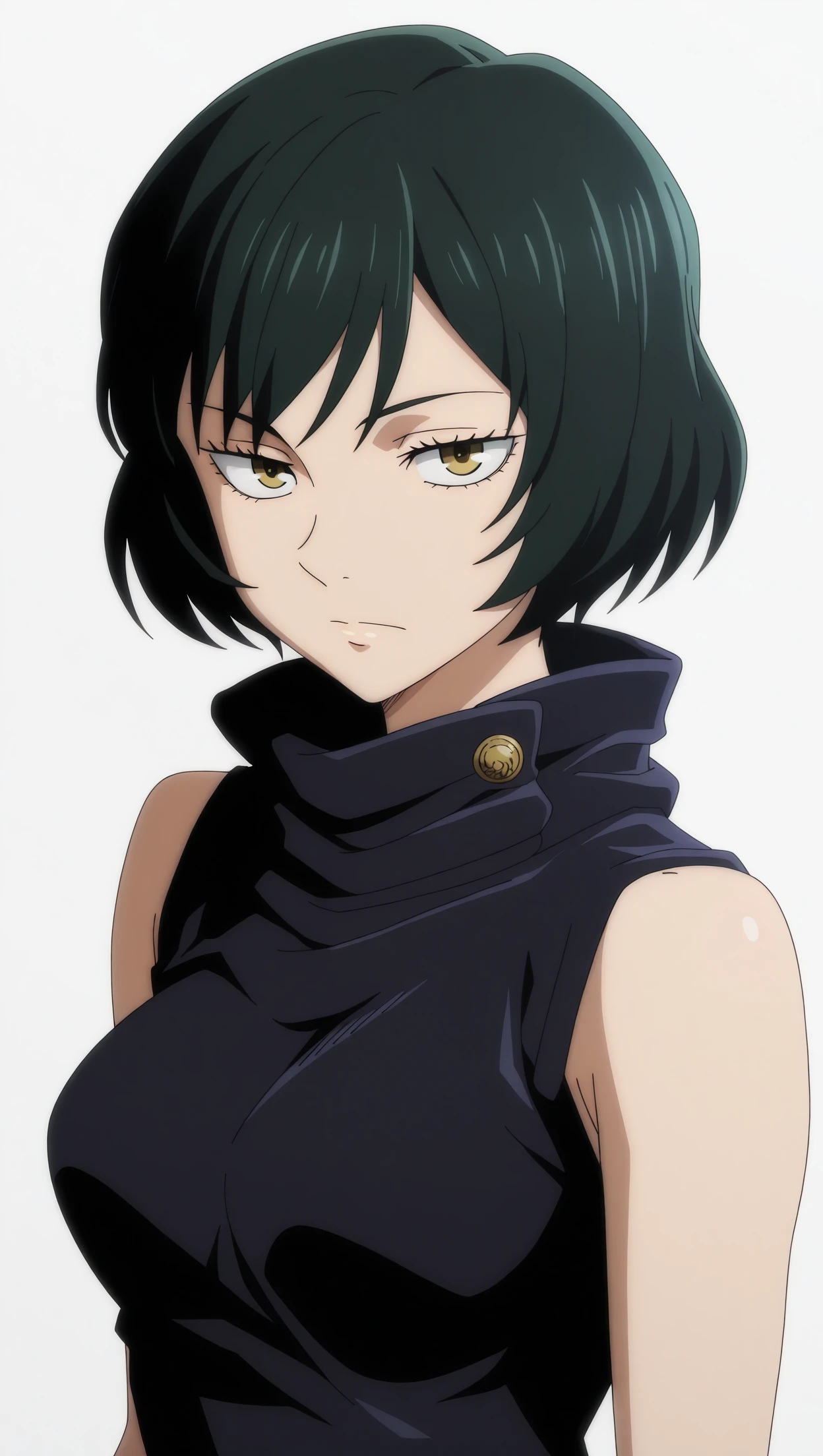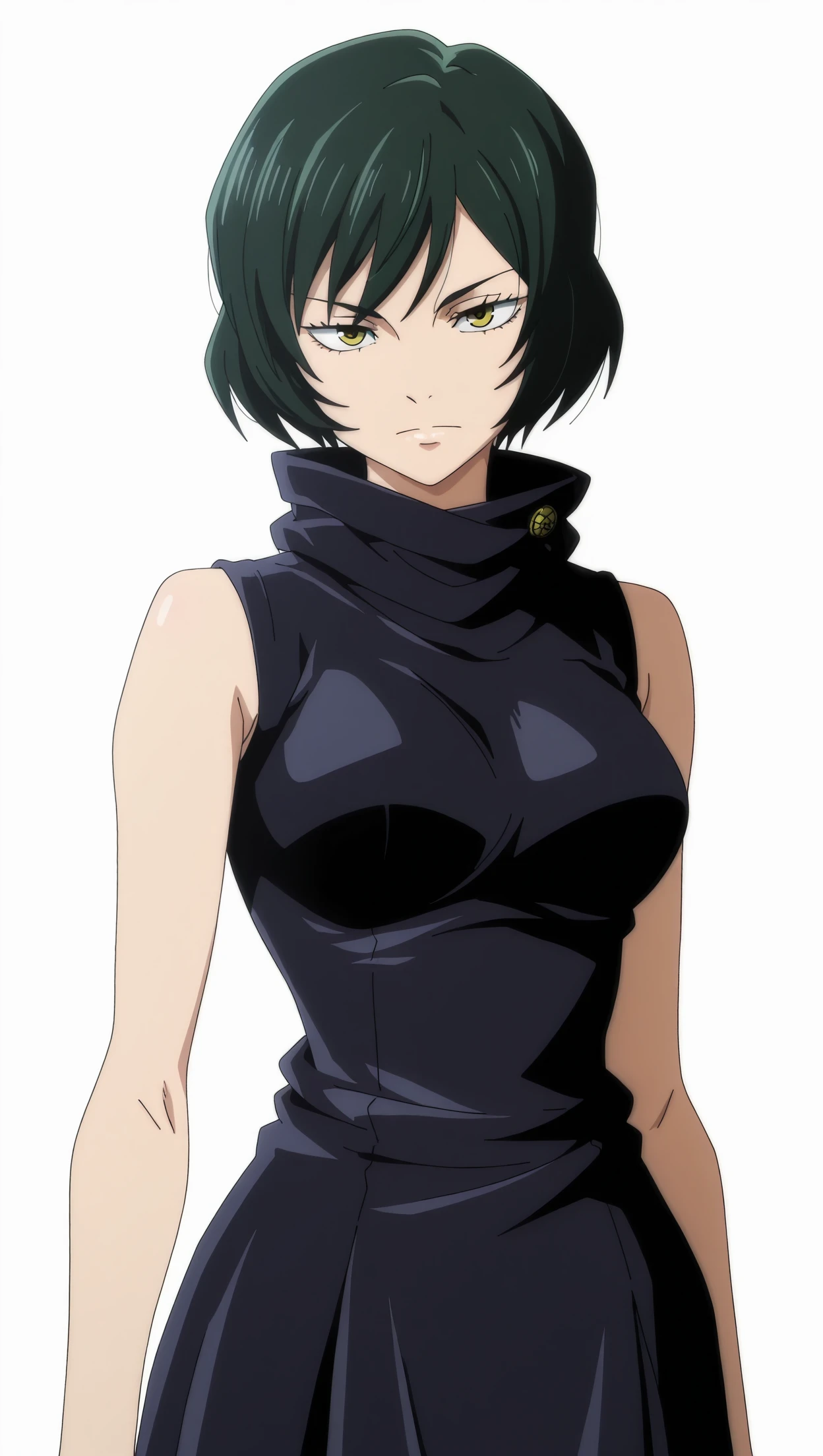anime coloring, masterpiece, best quality, amazing quality, mai, 1girl, short hair, green hair, yellow eyes, medium breasts, school uniform, dress, black dress, sleeveless turtleneck, sleeveless, turtleneck, bare shoulders, solo, pose, standing, looking at viewer, white background, simple background