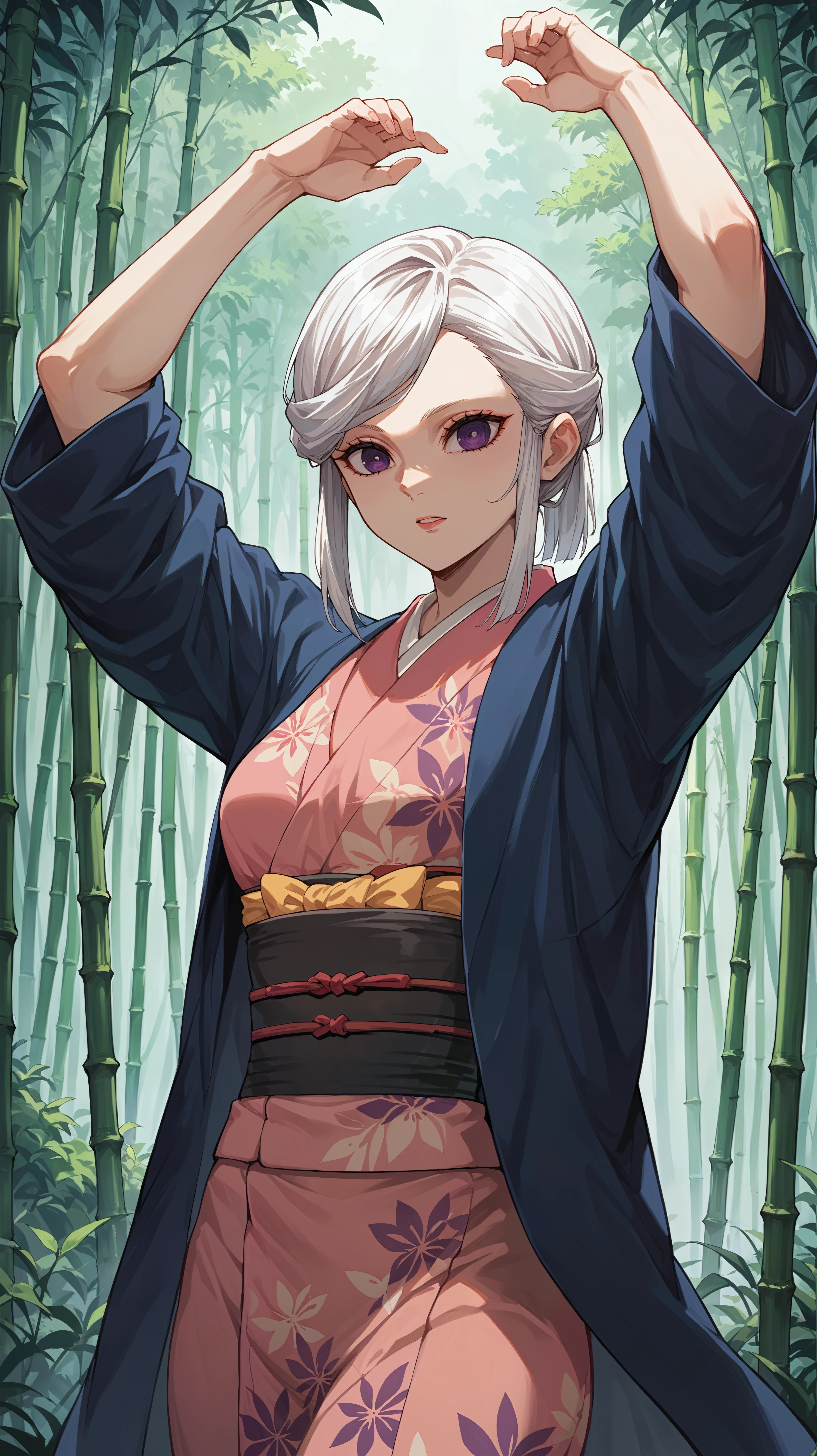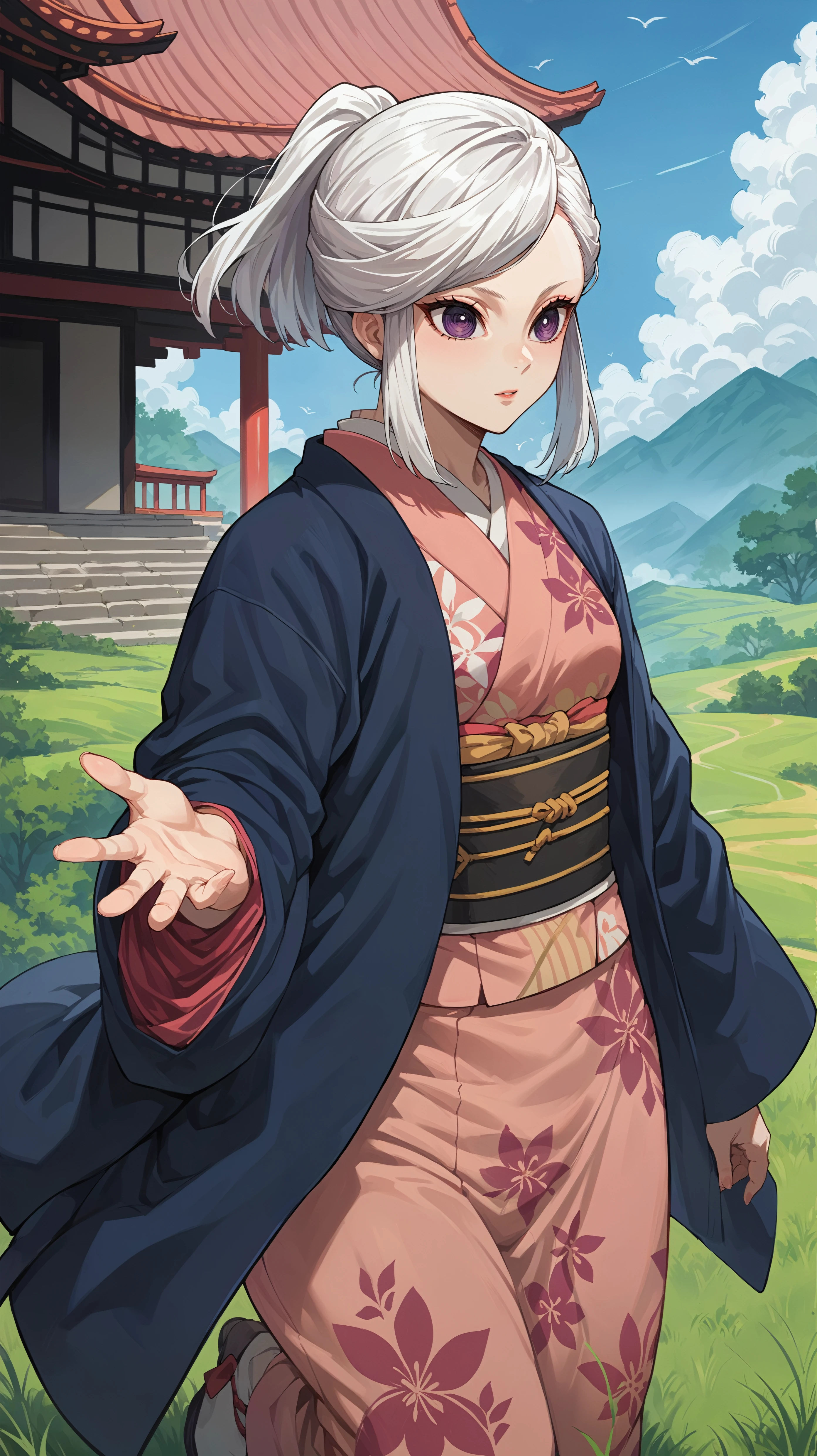 white hair, hair up, purple eyes, pink kimono, blue haori, blue coatDescription