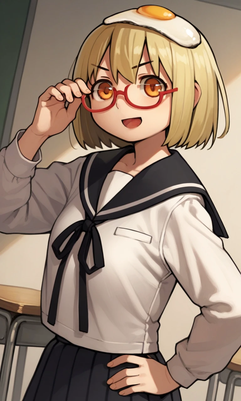 yamashita majime, egg on head, red-framed eyewear, school uniform, orange eyes, black sailor collar,