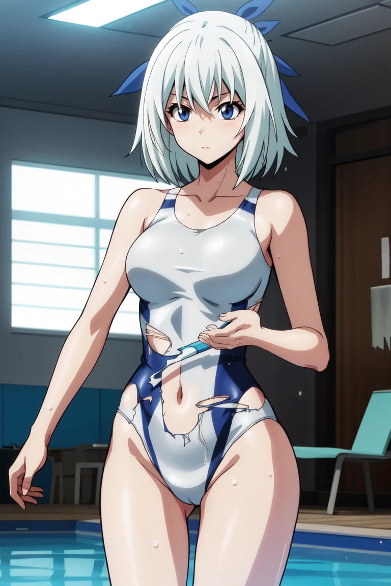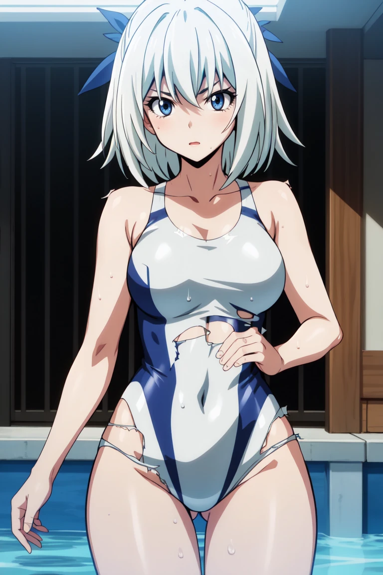 collarbone, white swimsuit, white one-piece swimsuit, back cutout, navel, (torn clothes, torn swimsuit:1.3), barefoot