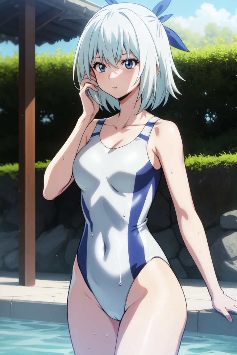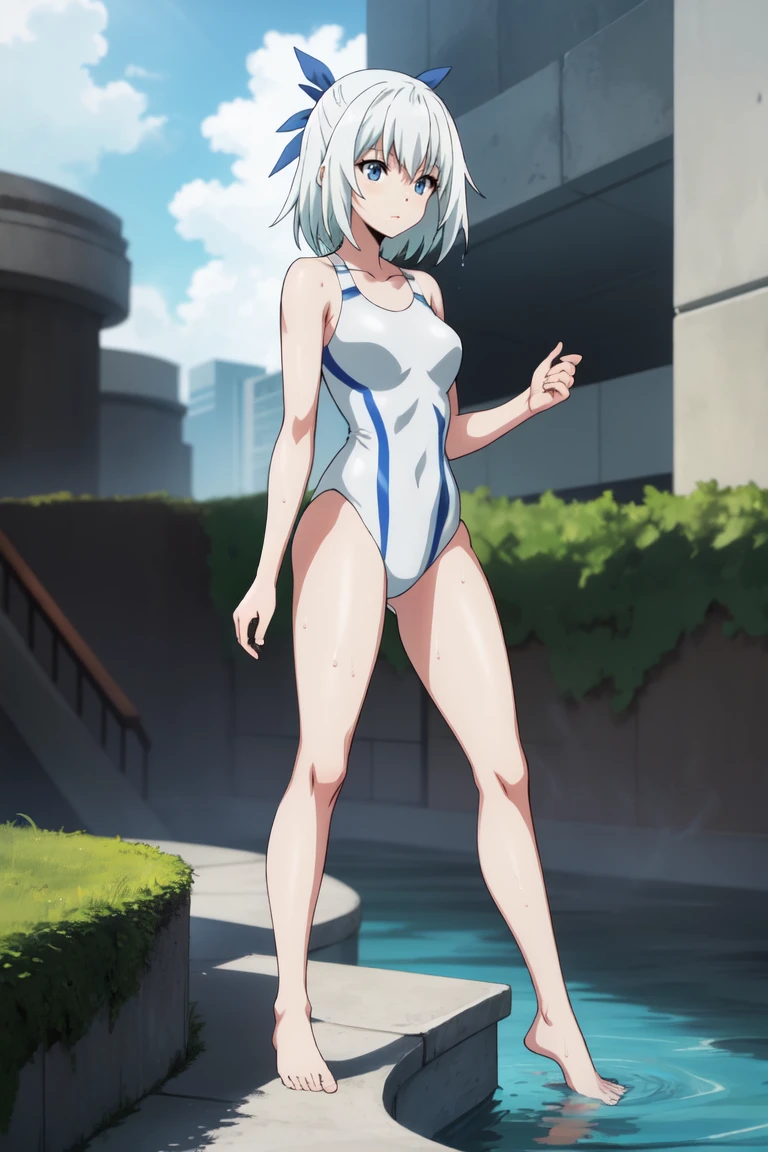 collarbone, white swimsuit, white one-piece swimsuit, barefoot