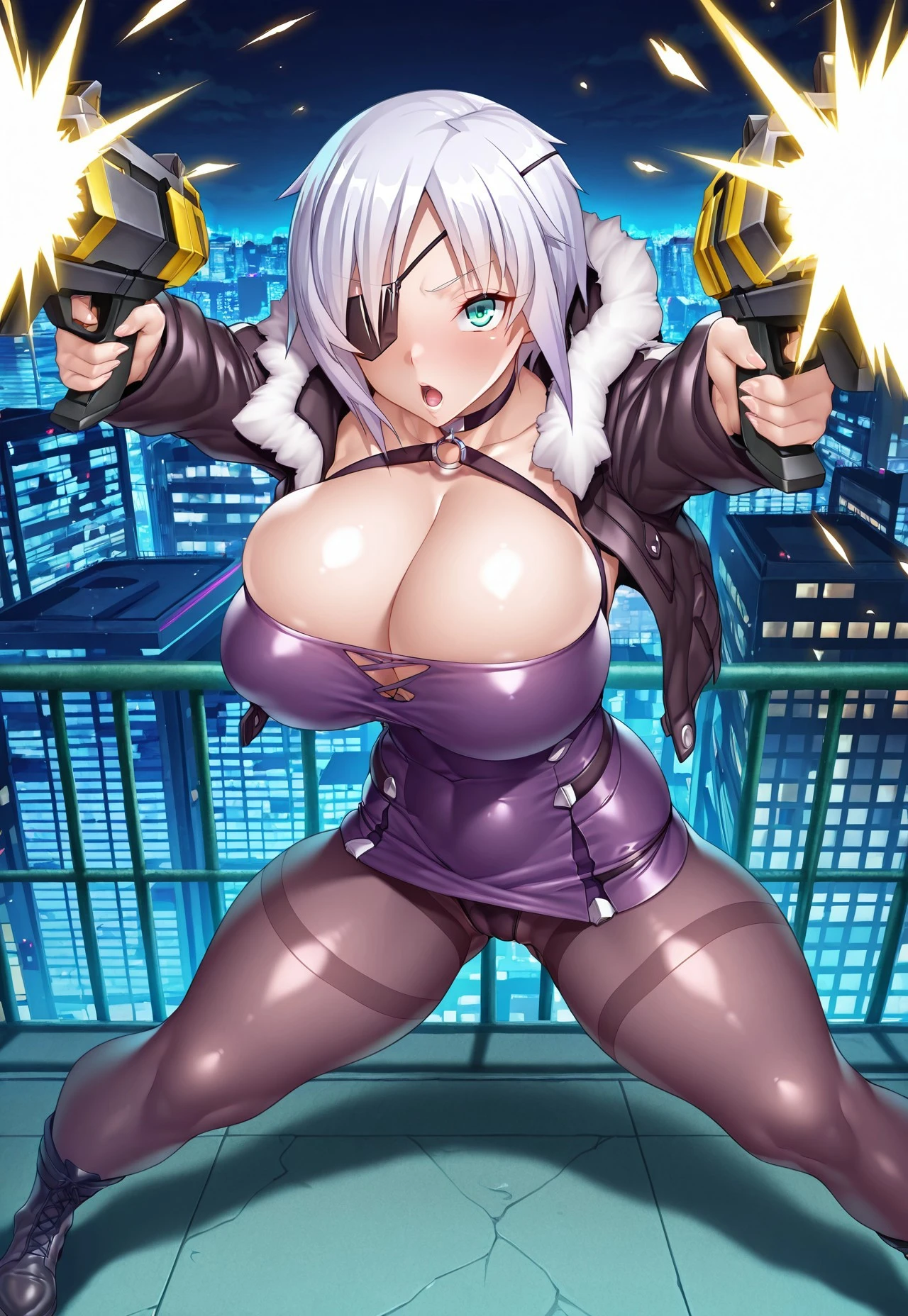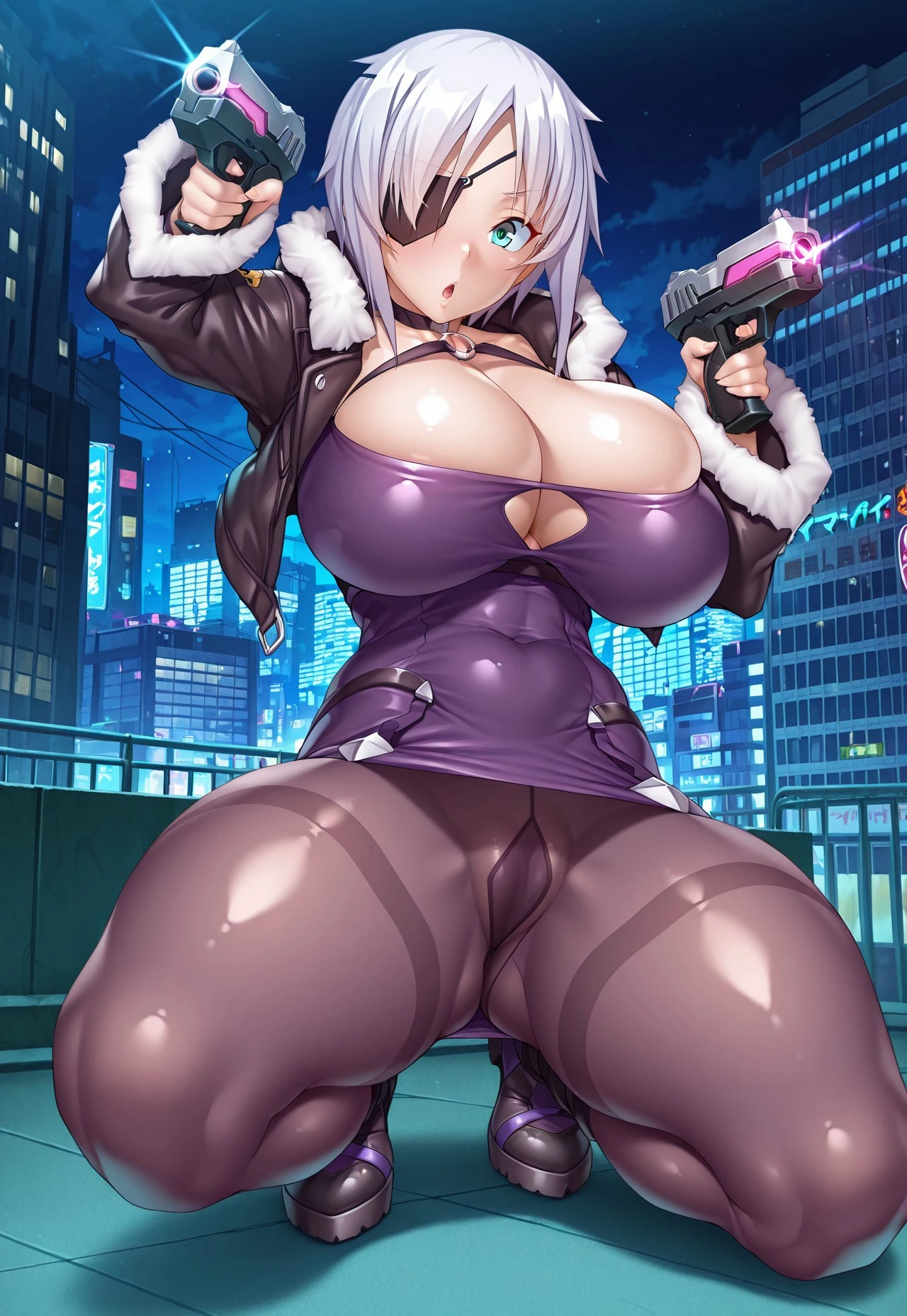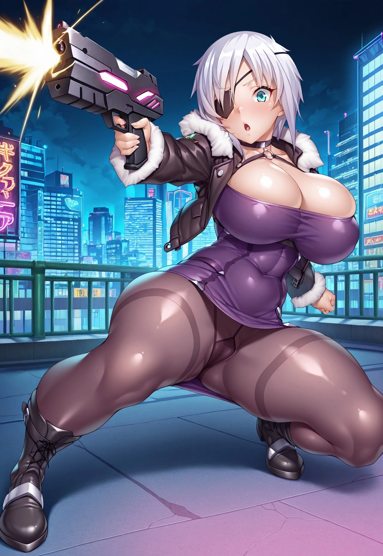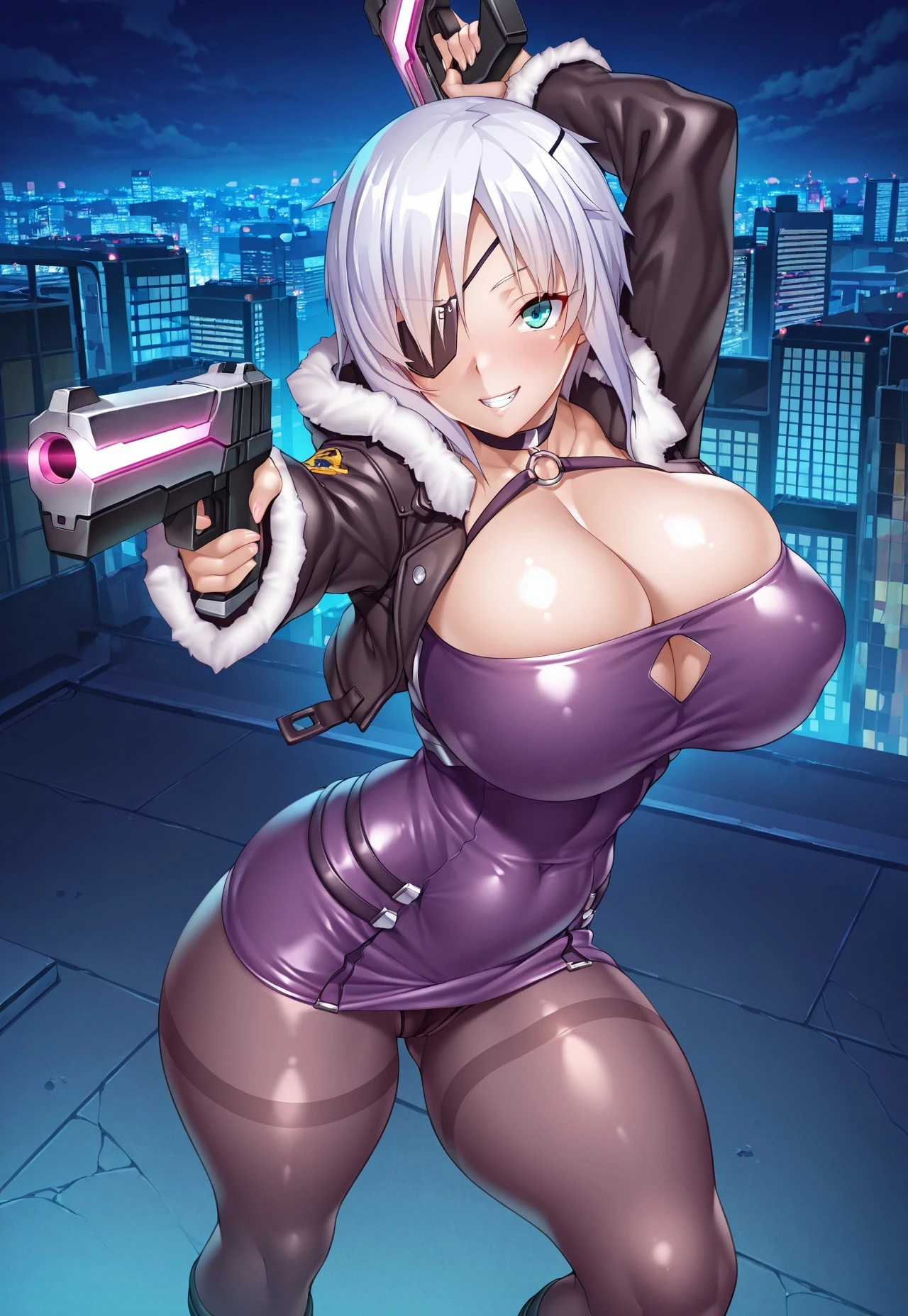 Tags: aina winchester, short hair, white hair, aqua eyes, parted bangs, eye patch, v-shaped eyebrows, large breasts, huge breasts, thick thighs, curvy
