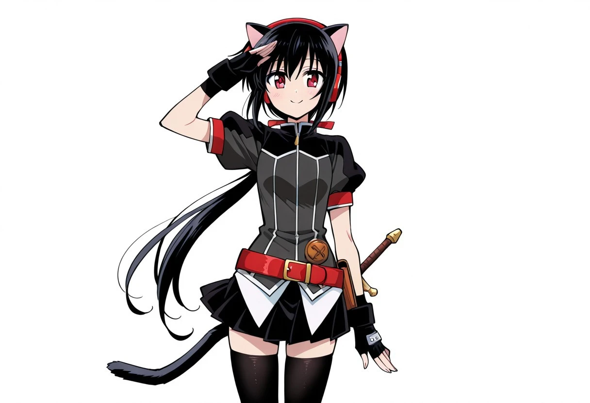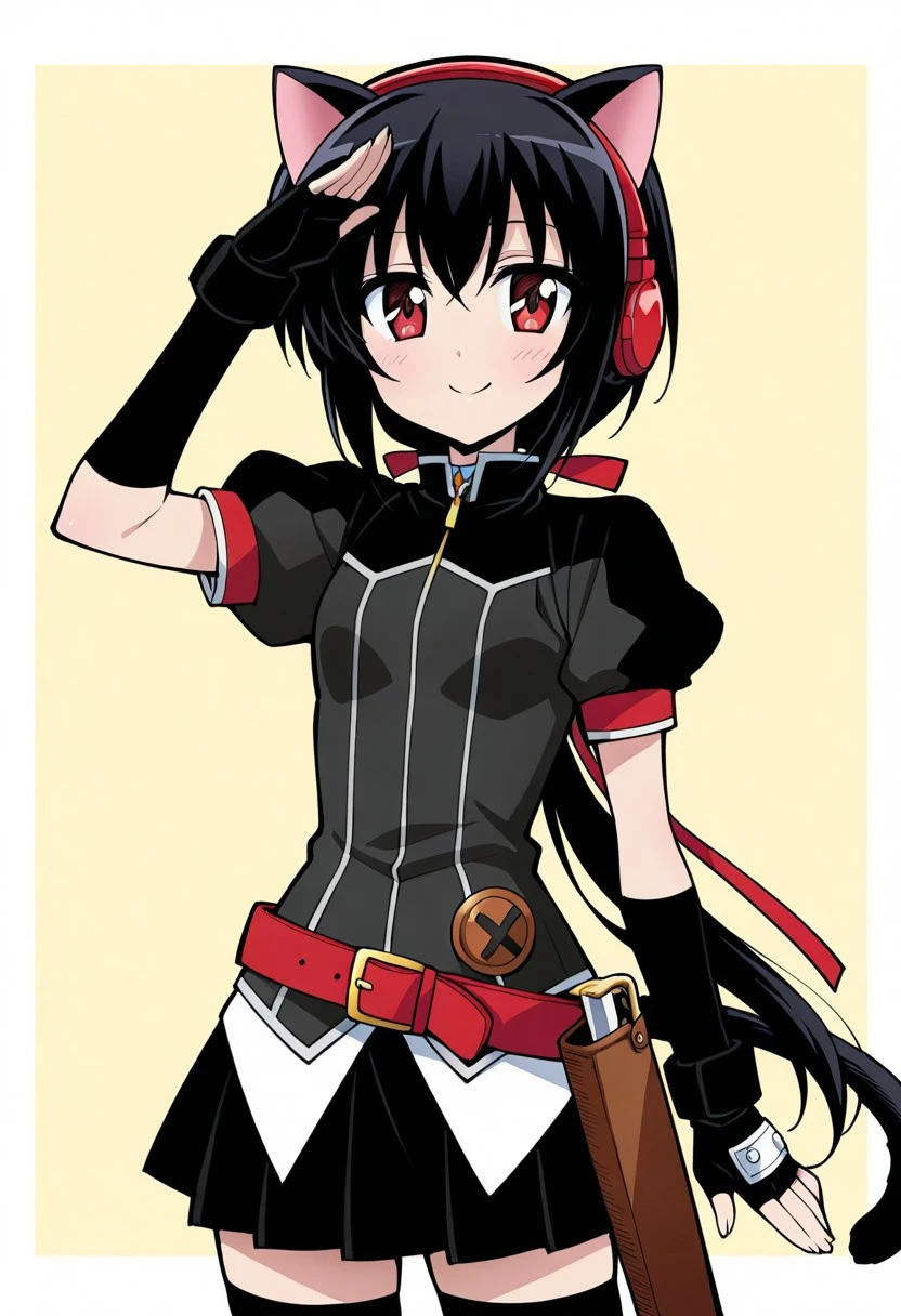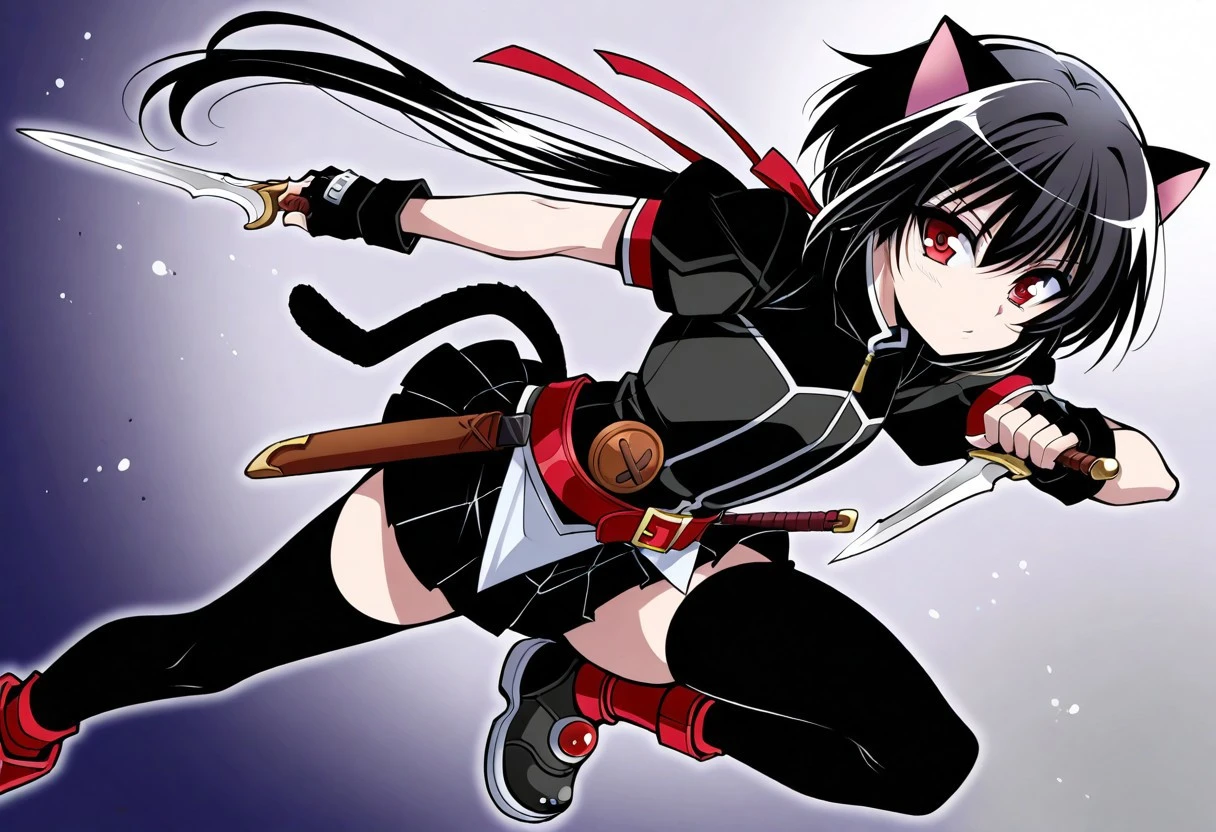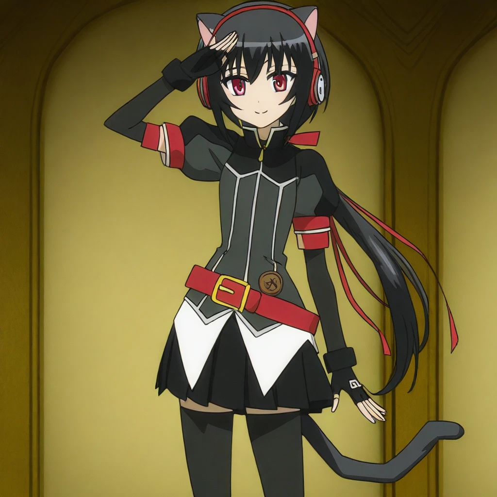 1girl, solo, NoirVinocacao, catgirl, cat ears, cat tail, red eyes, black hair, short hair, red hair ribbon, long hair, low ponytail, black and grey genois uniform, white undershirt, red sleeves trim, flat chest, red belt, puffy short sleeves, puffy sleeves, short sleeves, red wristbands with bells, short skirt, miniskirt, pleated skirt, black thighhigh