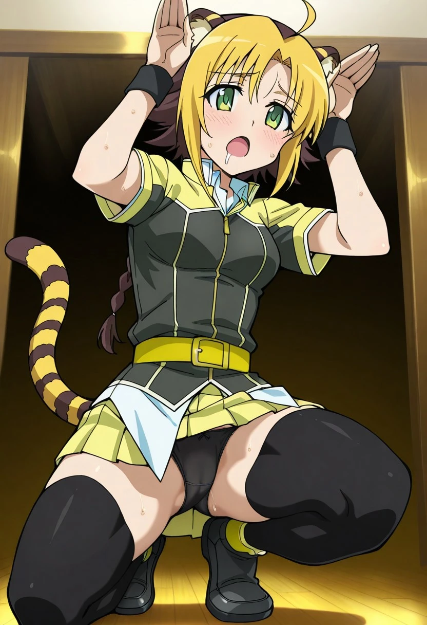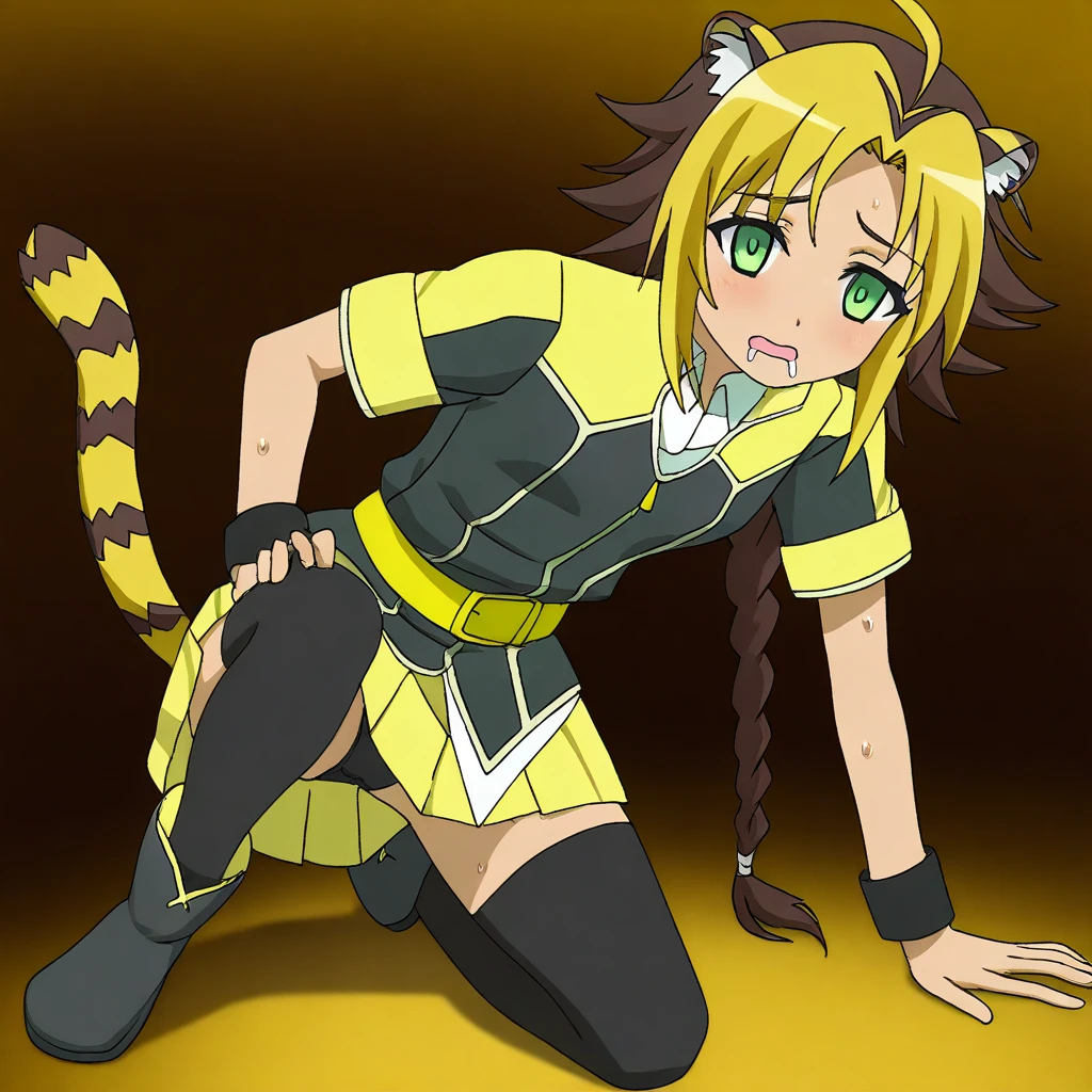1girl, solo, JauneClafoutis, catgirl, cat ears, cat tail, tiger ears, tiger tail, two-tone hair, brown hair, blonde hair, blonde bangs, dyed bangs, green eyes, medium length hair, braided hair, yellow and grey genois uniform, open collar, white undershirt, yellow sleeves trim, flat chest, yellow belt, short sleeves, short skirt, miniskirt, pleated skirt, black wristbands, black thighhighs