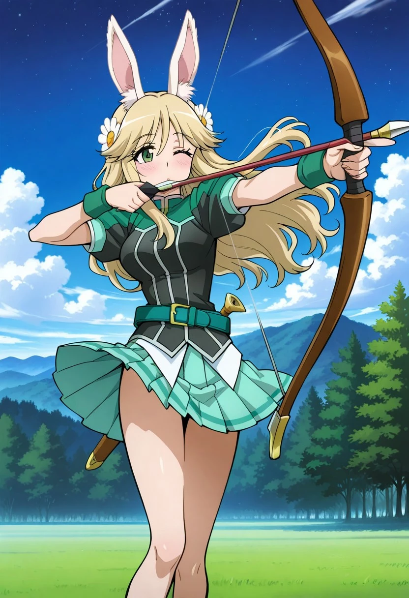 1girl, solo, Vertfarbreton, rabbit girl, bunny ears, white ears, hair flowers, daisies, long hair, blonde hair, green eyes, green and grey genois uniform, white undershirt, teal sleeves trim, large breasts, green belt, puffy short sleeves, puffy sleeves, short sleeves, teal skirt, medium skirt, pleated skirt, green wristbands, black pantyhose