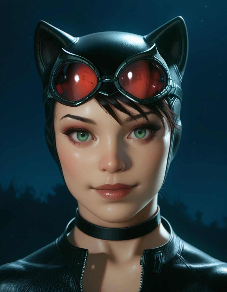 Catwoman prompt: 1girl, catwoman, green eyes, animal ears, dark hair, collar, breasts, cleavage