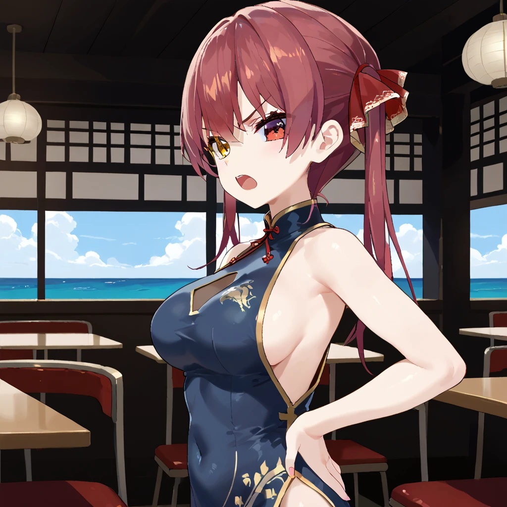 score_9,score_8_up,score_7_up,source_anime,high res image,shiny hair,ultra detailed eyes,1girl,houshou_marine,breasts,solo,twintails,red hair,rheterochromia,red eyes,yellow eyes,long hair,see-through cleavage,cleavage,see-through,looking at viewer,covered navel,ribbon,red dress,see-through leotard,hair ribbon,ascot,upper body,large breasts,blush,sleeveless,red ascot,red ribbon,brooch,leotard,bare shoulders,leotard under clothes,jewelry,closed mouth,buttons,large breasts,arrow through heart,choker,white glove,<lora:Houshou_Marine_宝鐘マリン_hololive_Vtube-000006:0.8>,