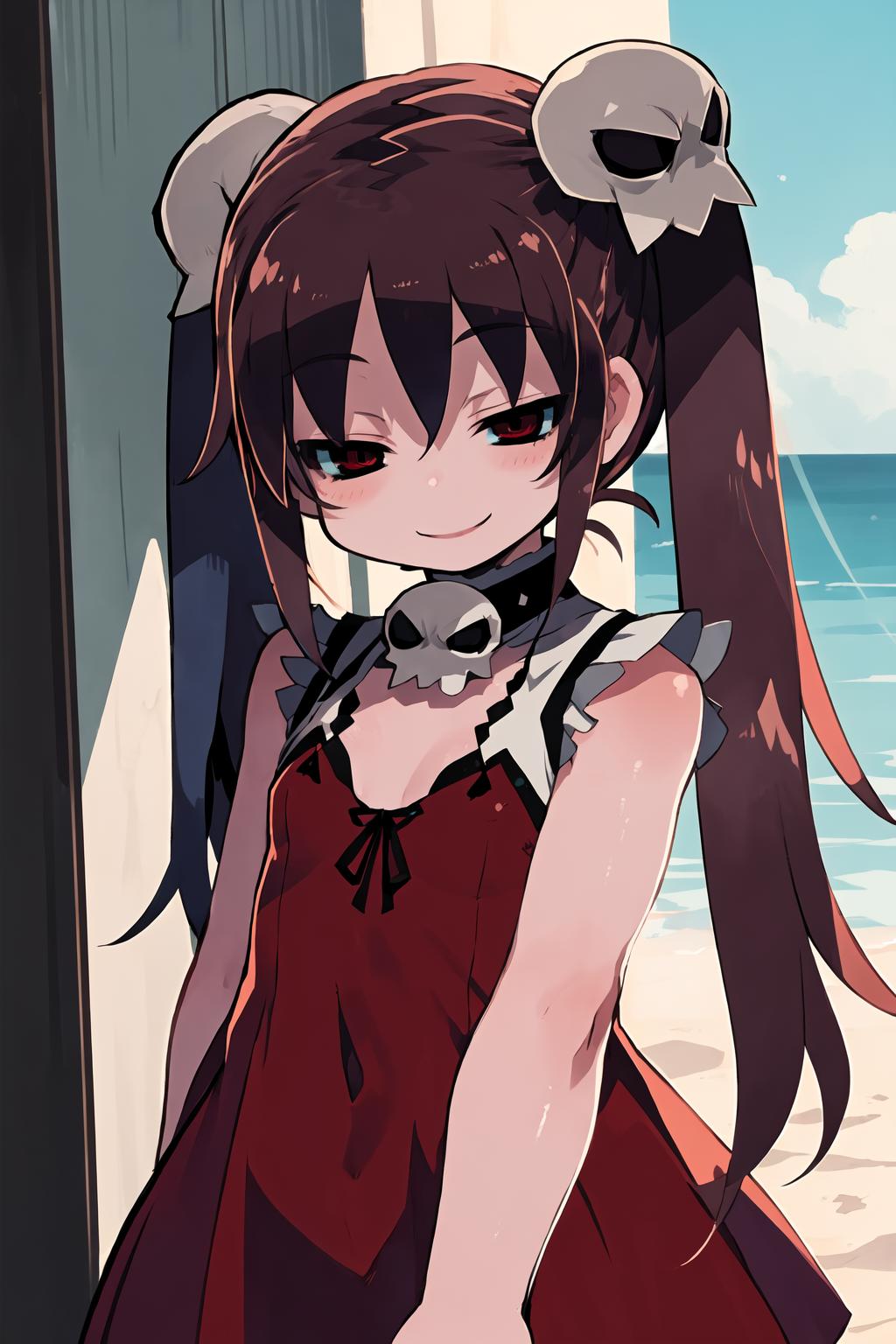 For better results use the default prompt: 1girl, solo, henrietta (zankuro), skull hair ornament, twintails, red eyes, brown hair, long hair, flat chest, white bikini