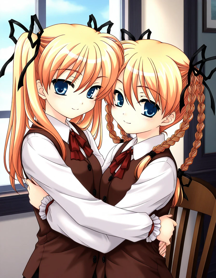 Itsuki&Imi, multiple girls, 2girls, blonde hair, twins, siblings, blue eyes, twintails, braid, ribbon, sisters, twin braids, hair ribbon, long hair, chair, short stack,