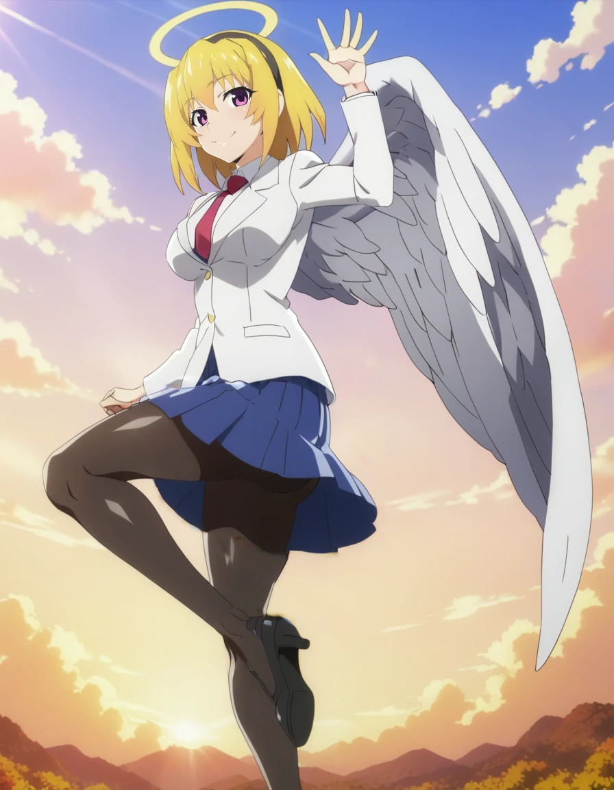 looking at viewer,angel wings,halo,sky,cloud,midair,full body,辺りを入れるとそれっぽくなります。