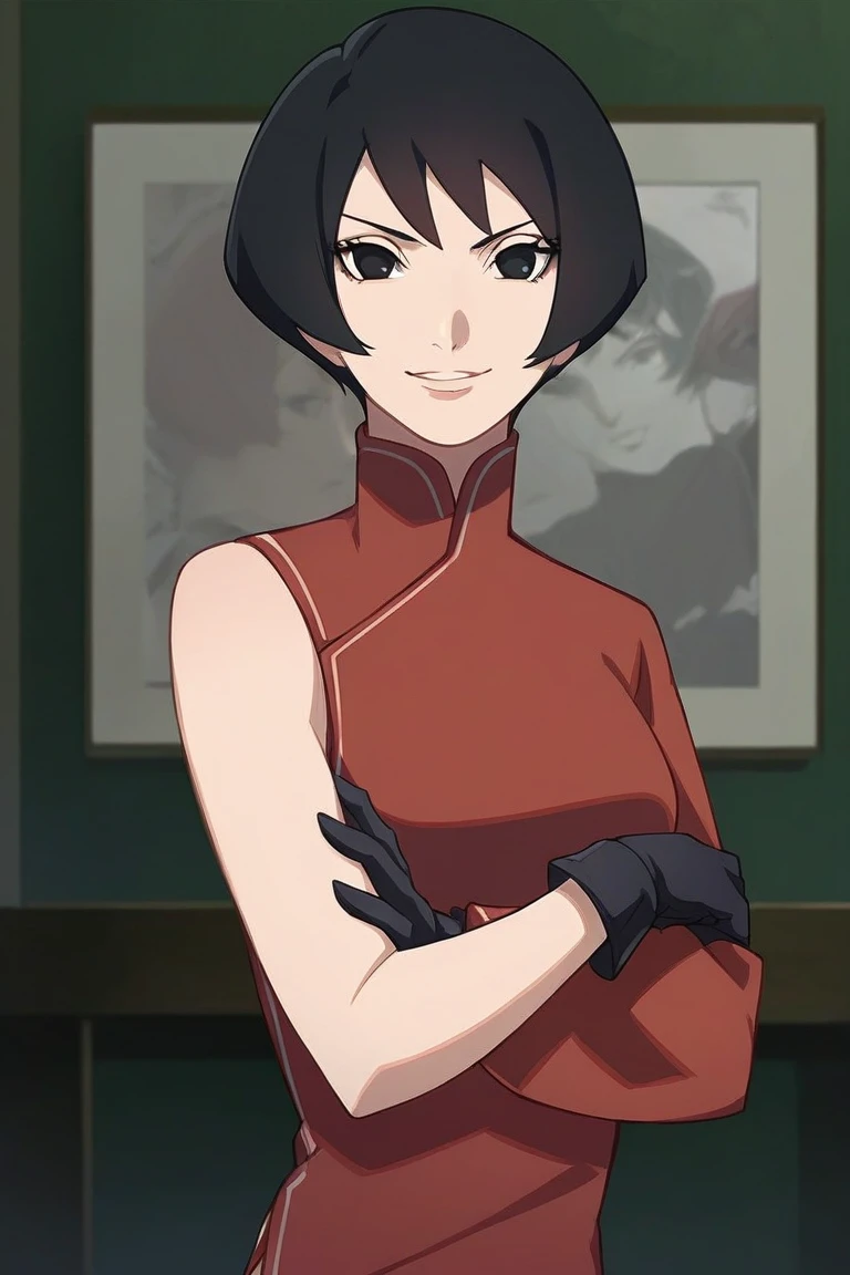 kur0tsuch1, black hair, short hair, black eyes, chinese clothes, china dress, side slit, black gloves, sandals