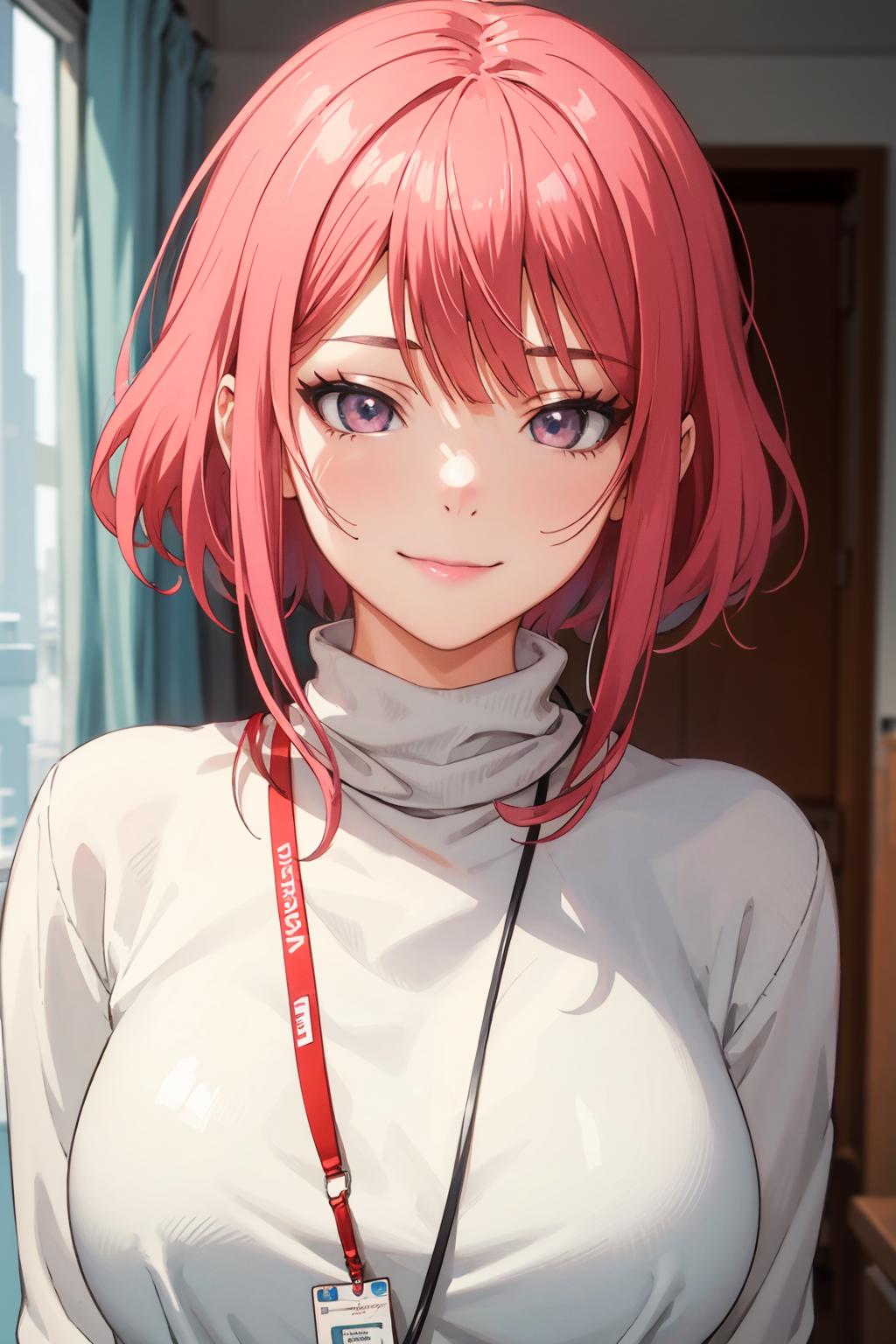 white sweater, turtleneck ,long sleeves, grey skirt,pencil skirt,office lady, id card, lanyard,