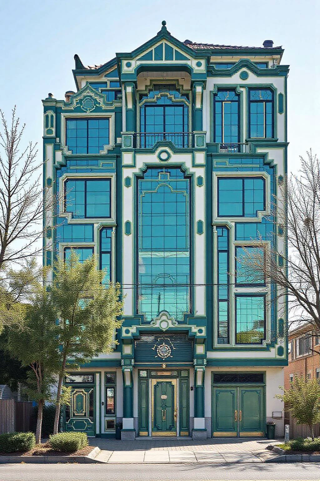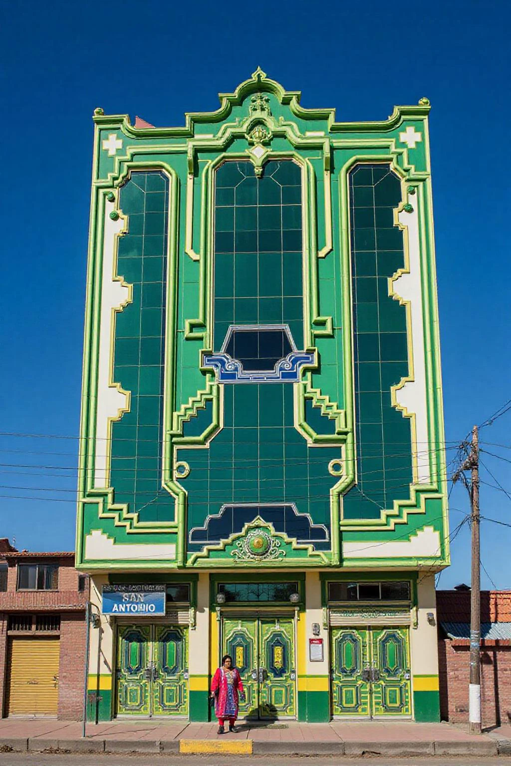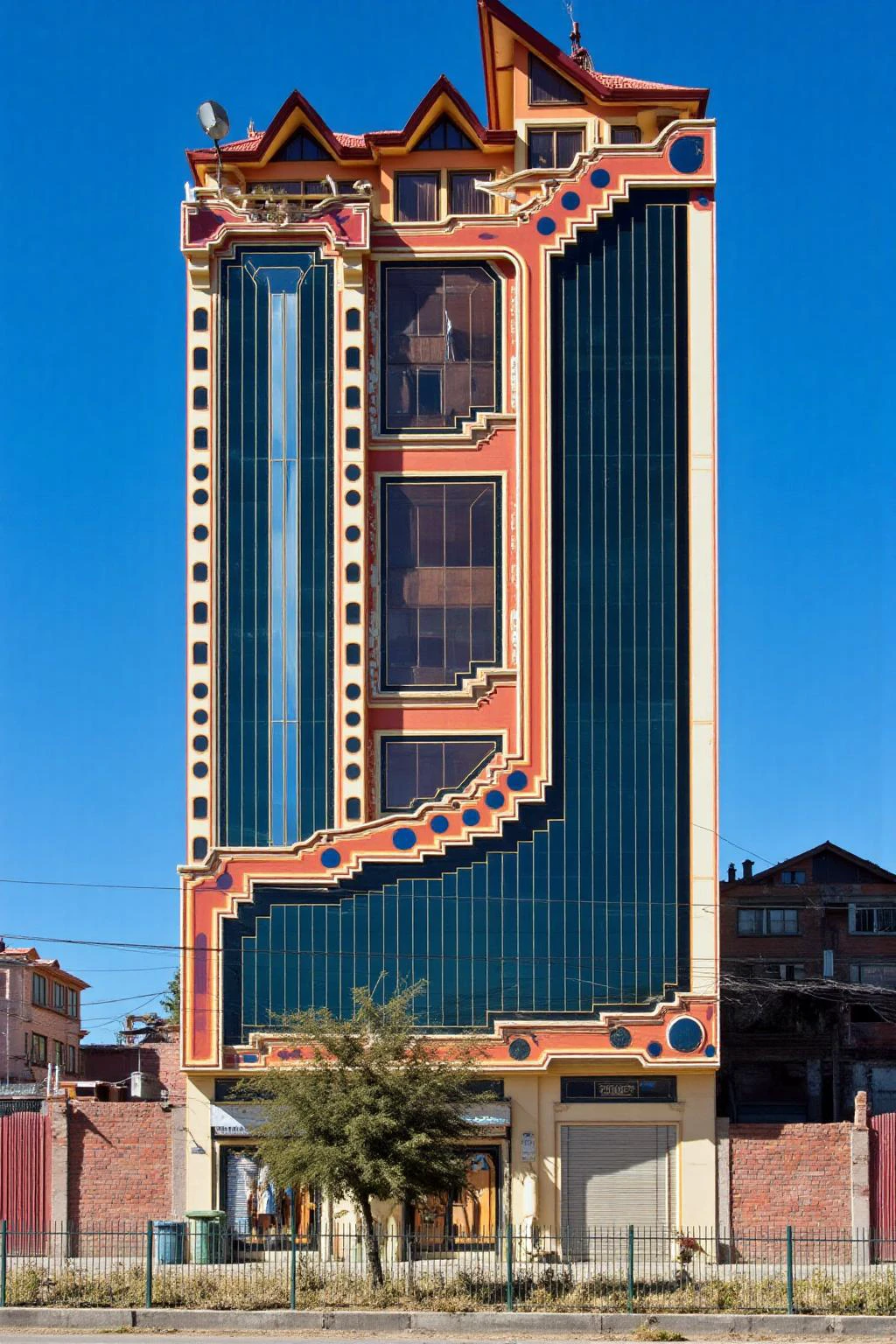 The bulk of the buildings in El Alto are simple, unadorned brick structures; Neo-Andean structures are typically similar in underlying structure, but with the addition of very elaborate decorative facades. These facades feature a harmony of cornered straight lines representing the masculine and curves representing the feminine prominent in Tiwanaku ruins known as the chacha-warmi; their colour palette often take on those of traditional Aymara fabrics.[3] Many older buildings around El Alto have been renovated with neo-Andean style facades since the style became popular.