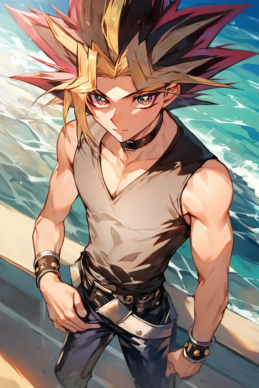 yami yugi, black hair, blonde hair, multicolored hair, spiked hair, black shirt, sleeveless shirt, blue jacket, jacket on shoulders, choker, bracelet, belt, pants, chain, chain necklace, millennium puzzle