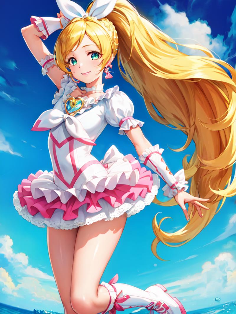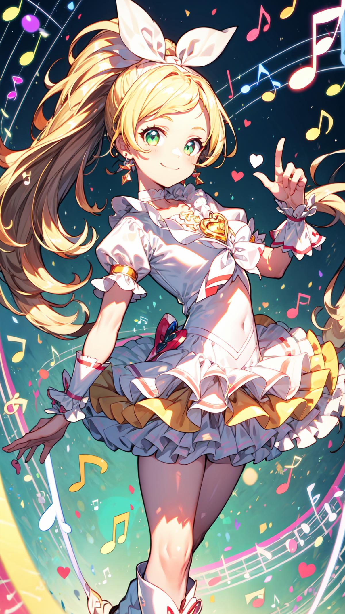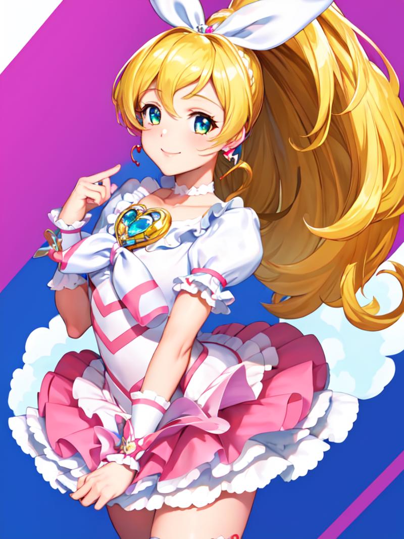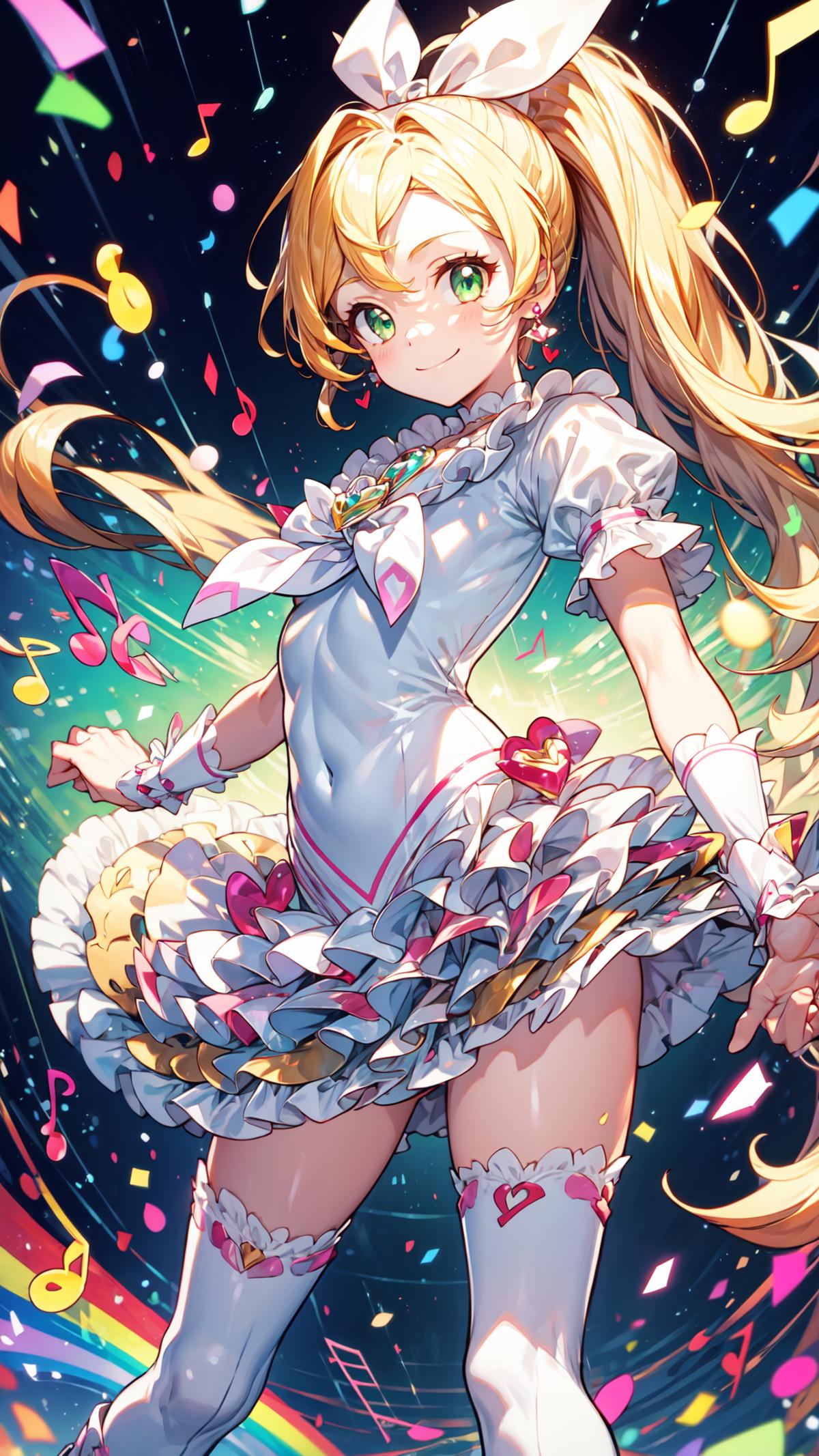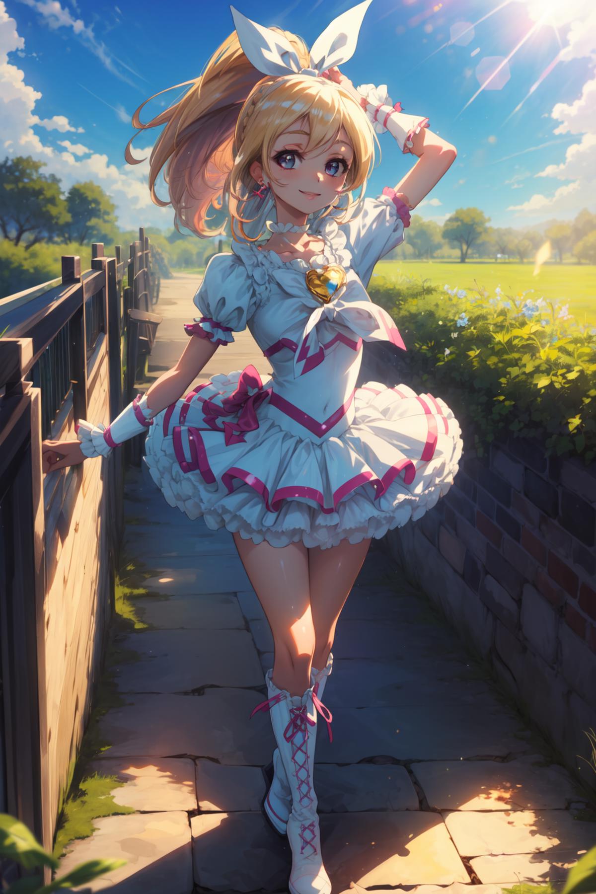 Recommend Tags: wide ponytail, puffy short sleeves, brooch, heart earrings, ribbon, arm warmers, white boots