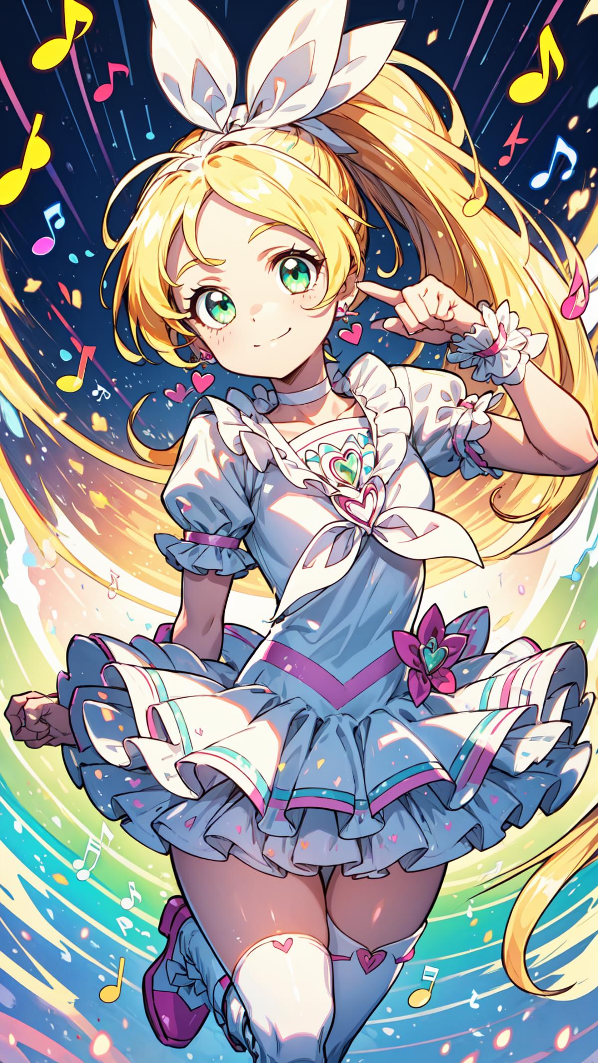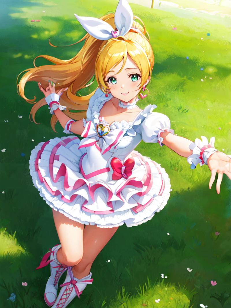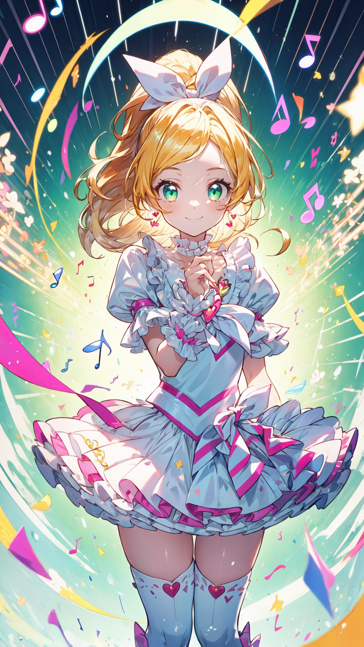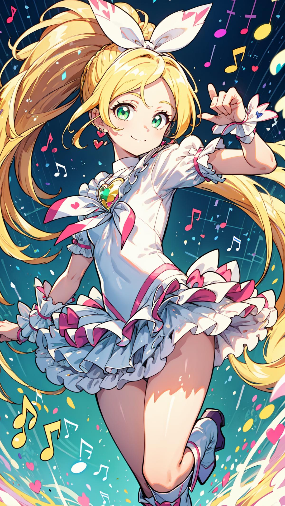 Recommend Tags: wide ponytail, puffy short sleeves, brooch, heart earrings, ribbon, arm warmers, white boots