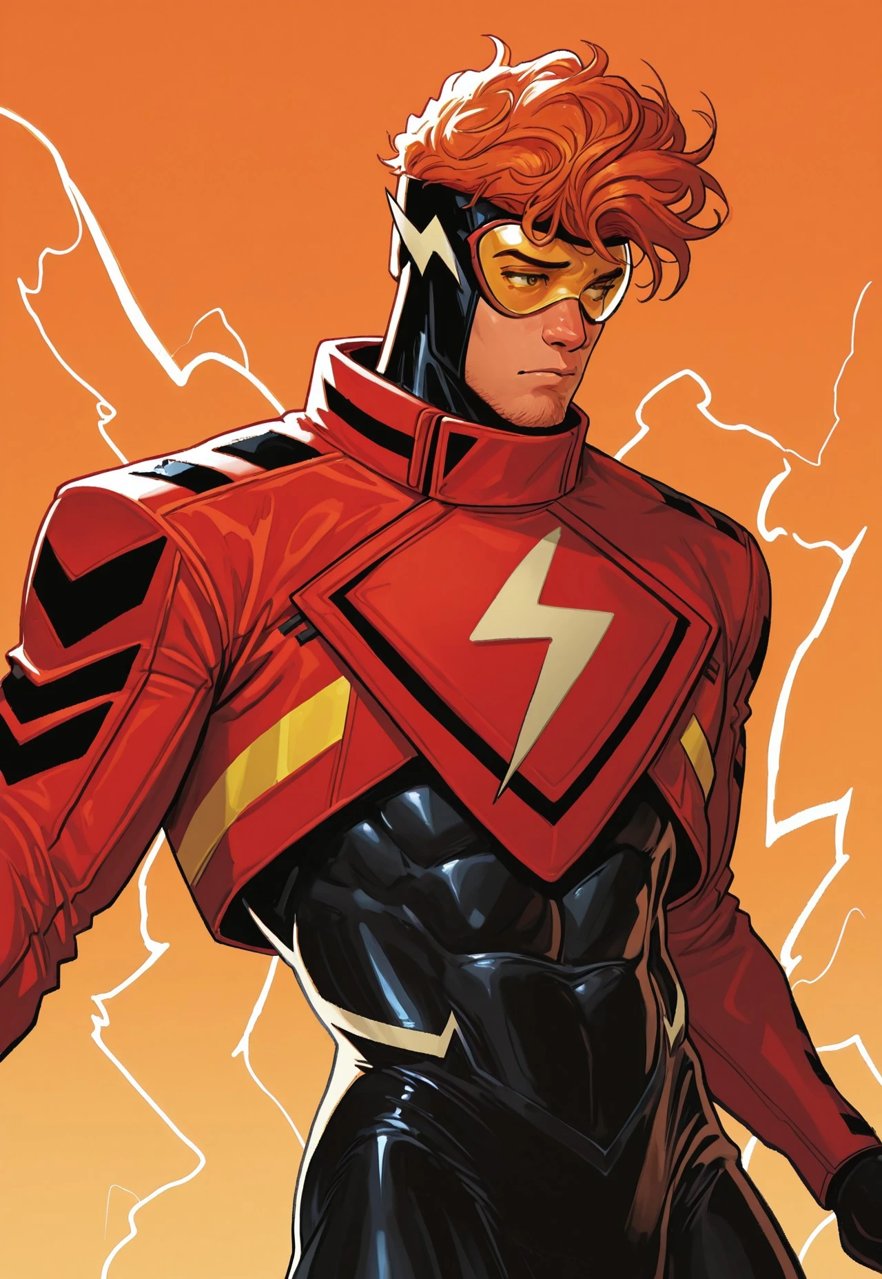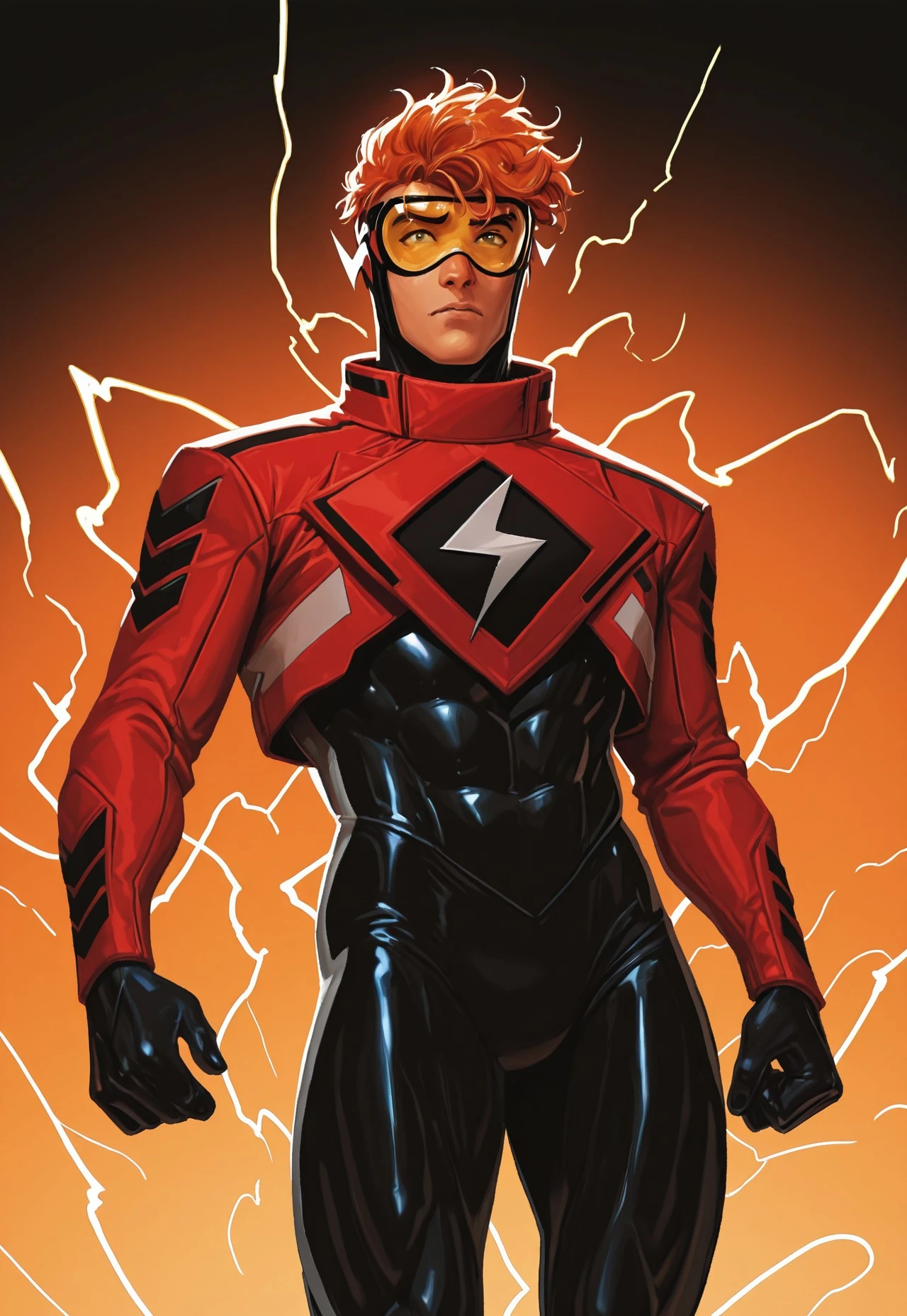ABS0FL4SH, orange hair, black bodysuit, bodysuit, red jacket, yellow goggles, short hair